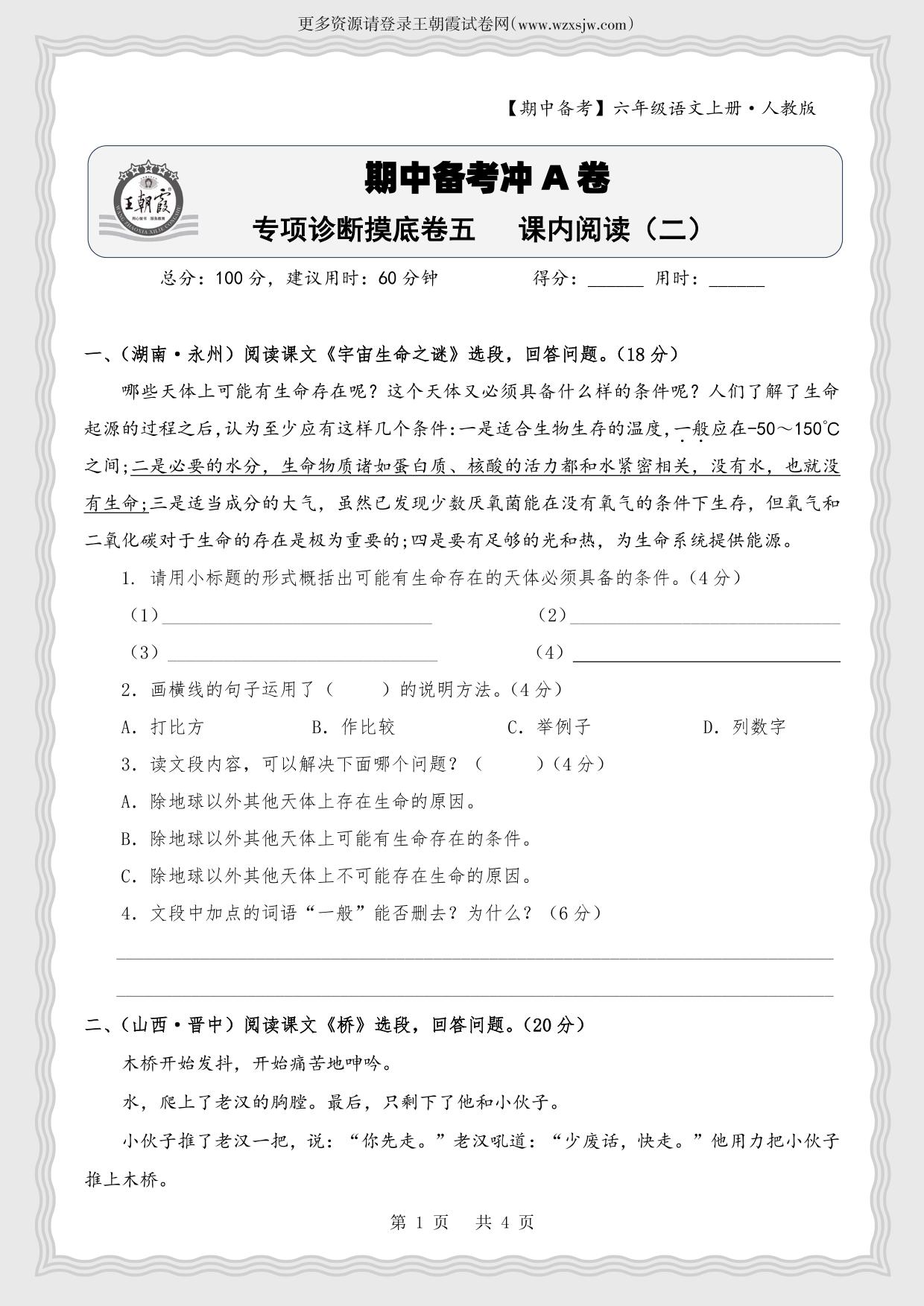 【期中备考】六年级语文上册人教版·专项诊断摸底卷五 课内阅读(二)