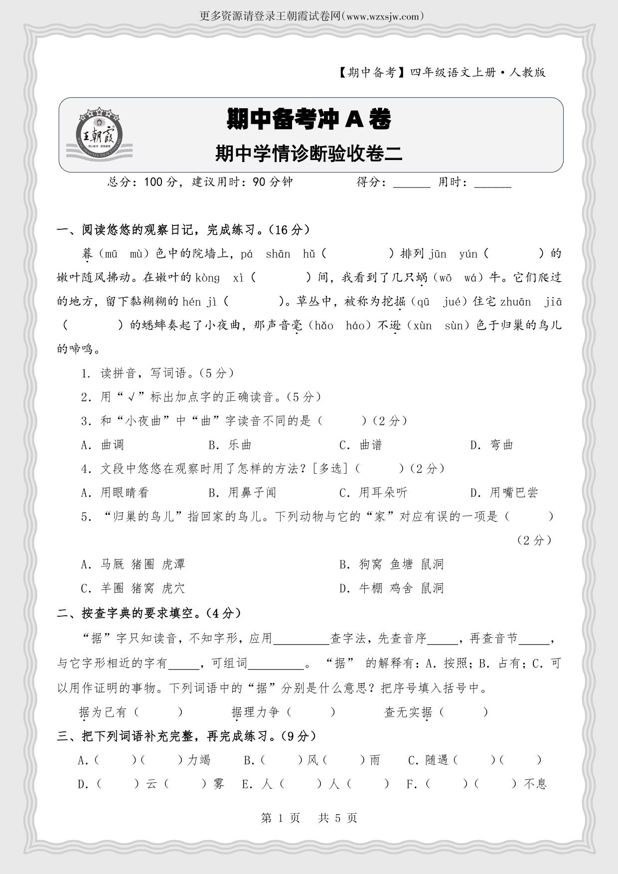 【期中备考】四年级语文上册人教版·期中学情诊断验收卷二