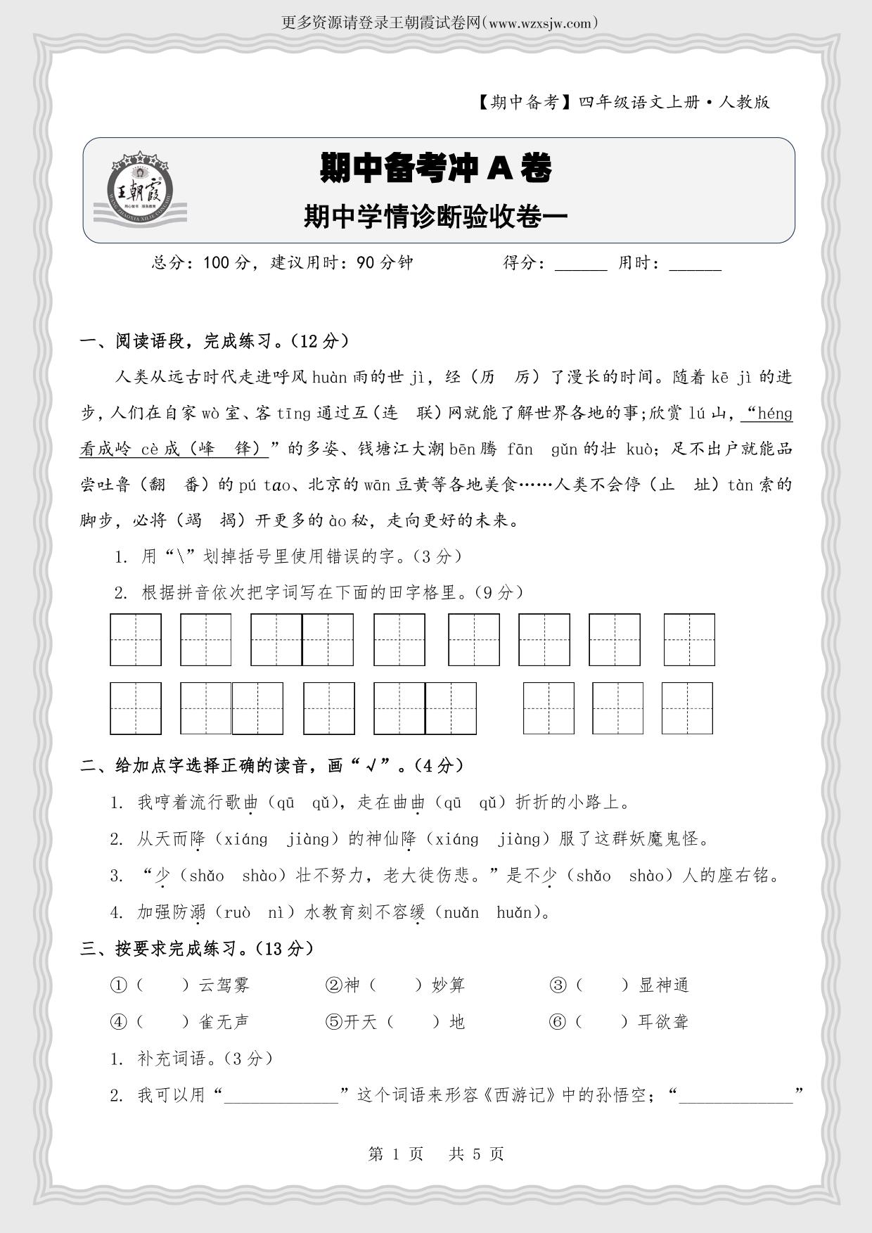 【期中备考】四年级语文上册人教版·期中学情诊断验收卷一