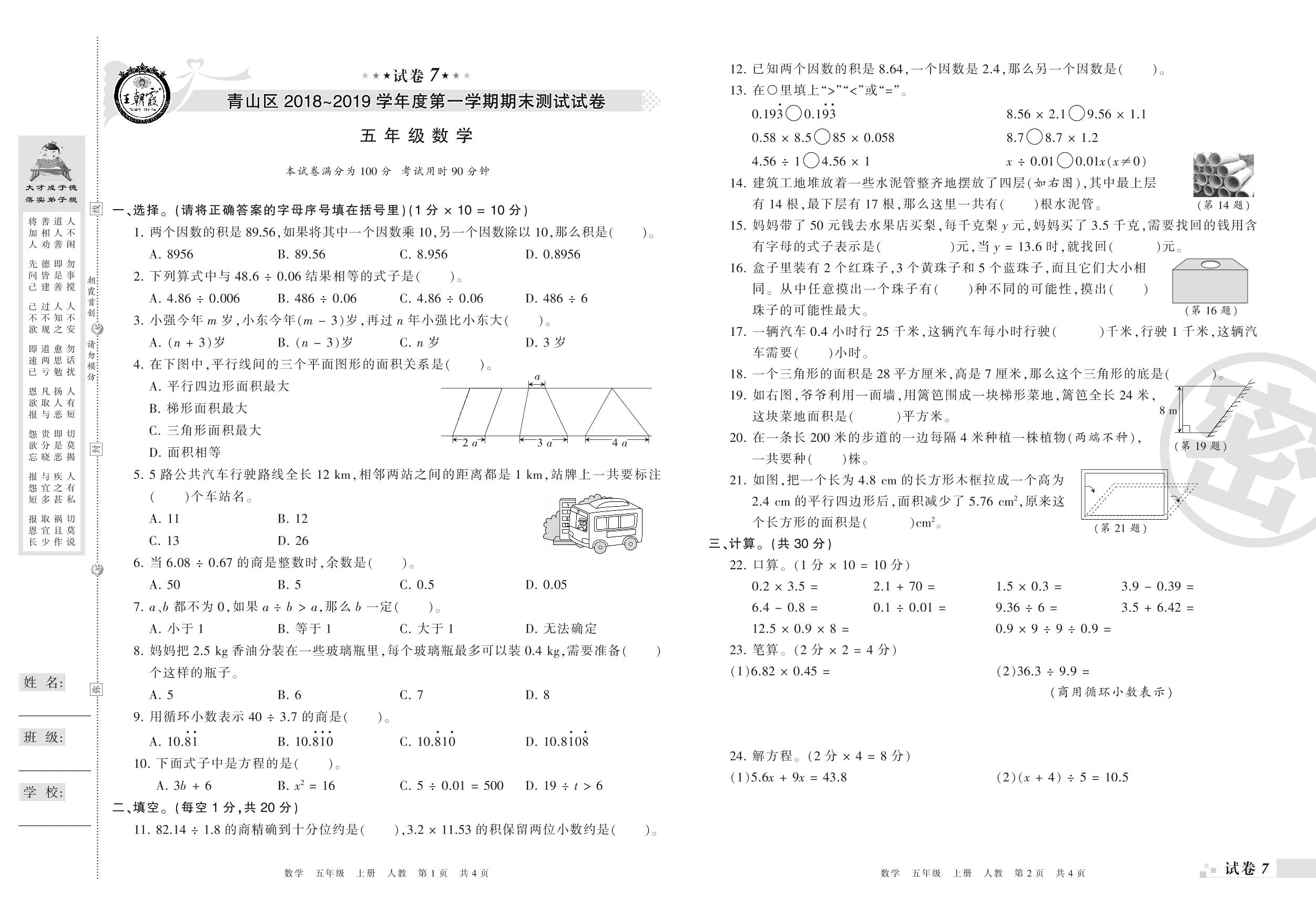 2018-2019学年第一学期武汉市青山区五年级数学试卷(人教版)【7】