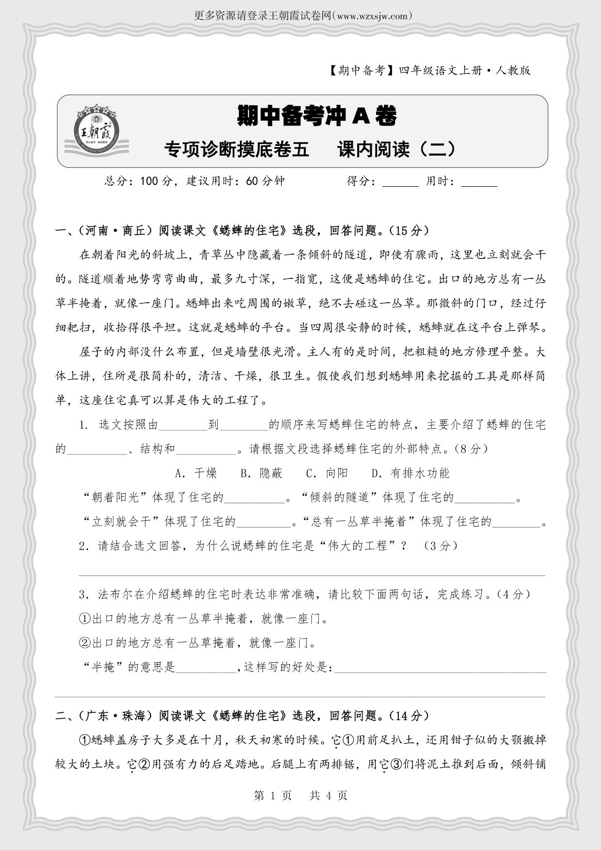 【期中备考】四年级语文上册人教版·专项诊断摸底卷五 课内阅读(二)