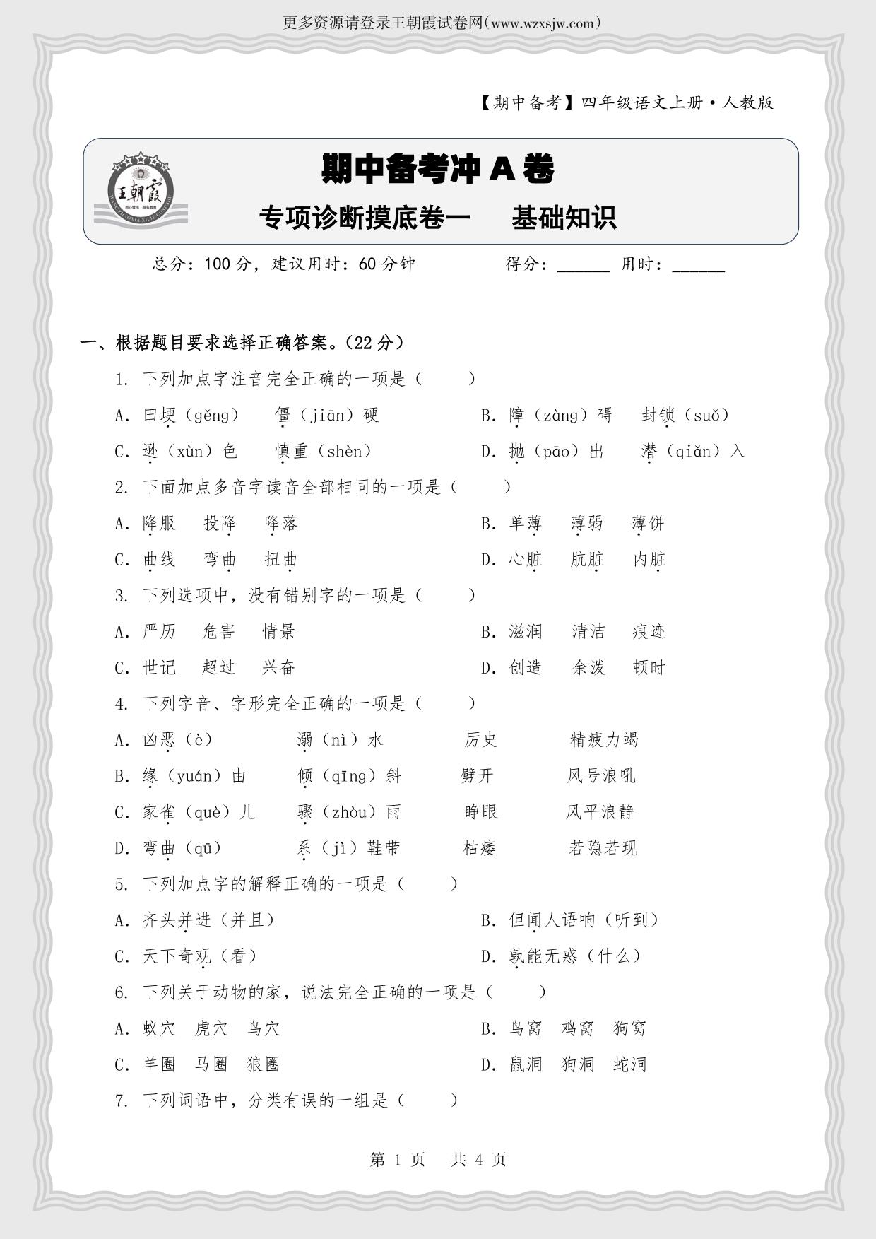 【期中备考】四年级语文上册人教版·专项诊断摸底卷一 基础知识