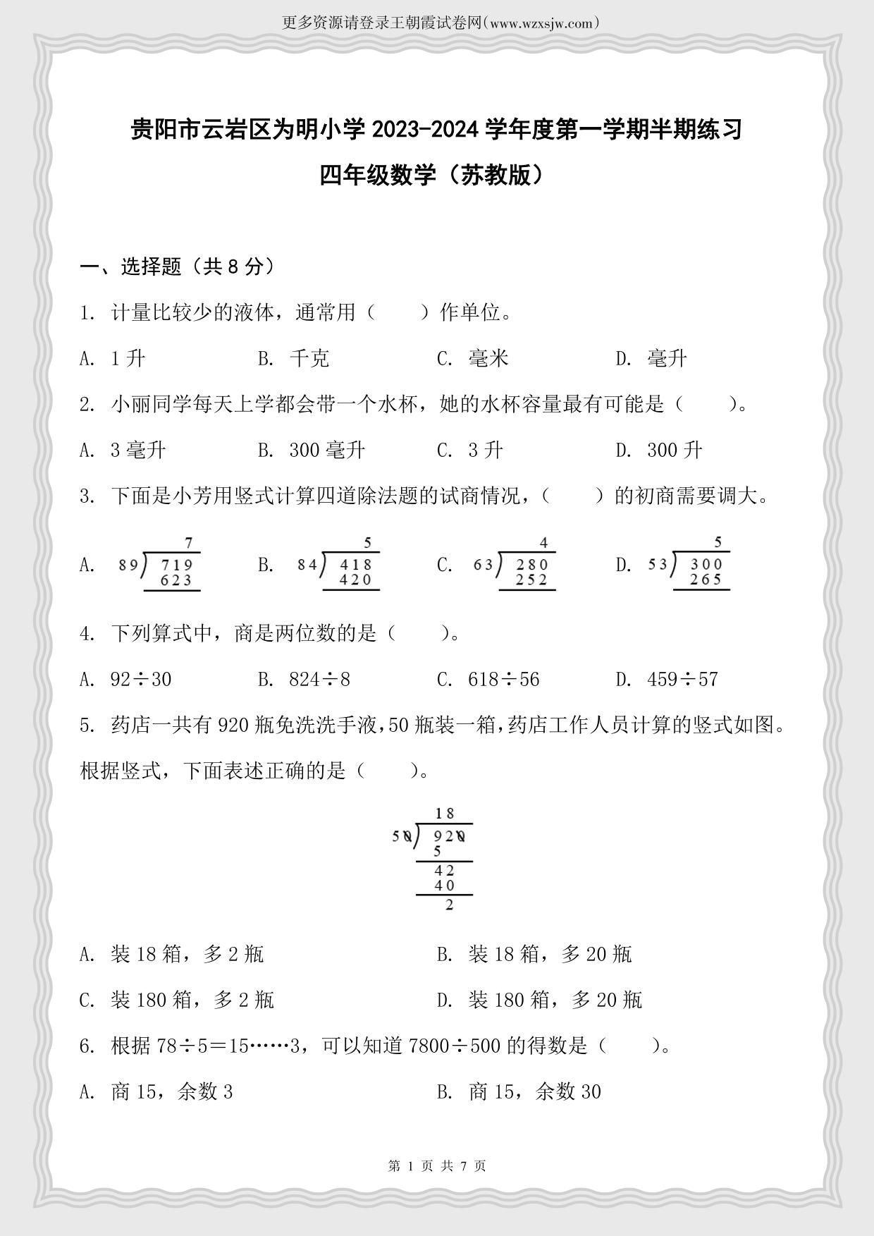 贵州省贵阳市云岩区为明小学2023-2024学年度第一学期期中练习四年级数学(苏教版)