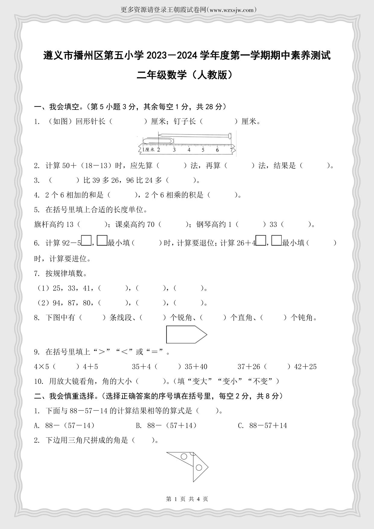 贵州省遵义市播州区第五小学2023-2024学年度第一学期期中素养测试二年级数学(人教版)