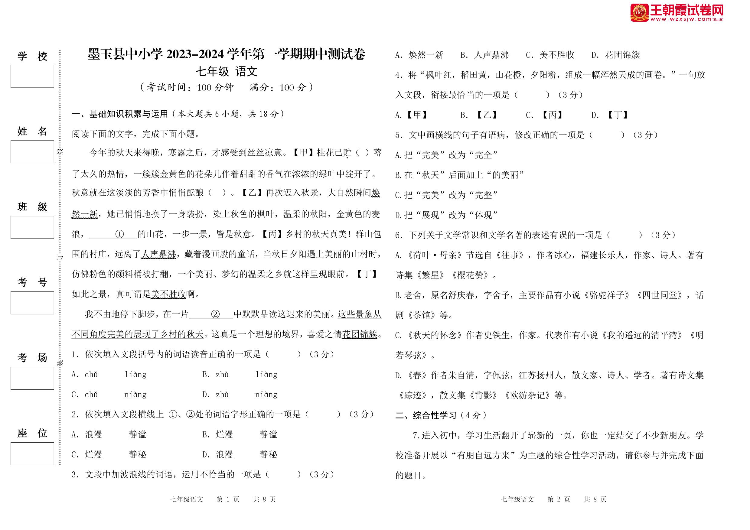 新疆维吾尔自治区和田地区墨玉县2023-2024学年第一学期期中测试卷七年级语文(人教版)