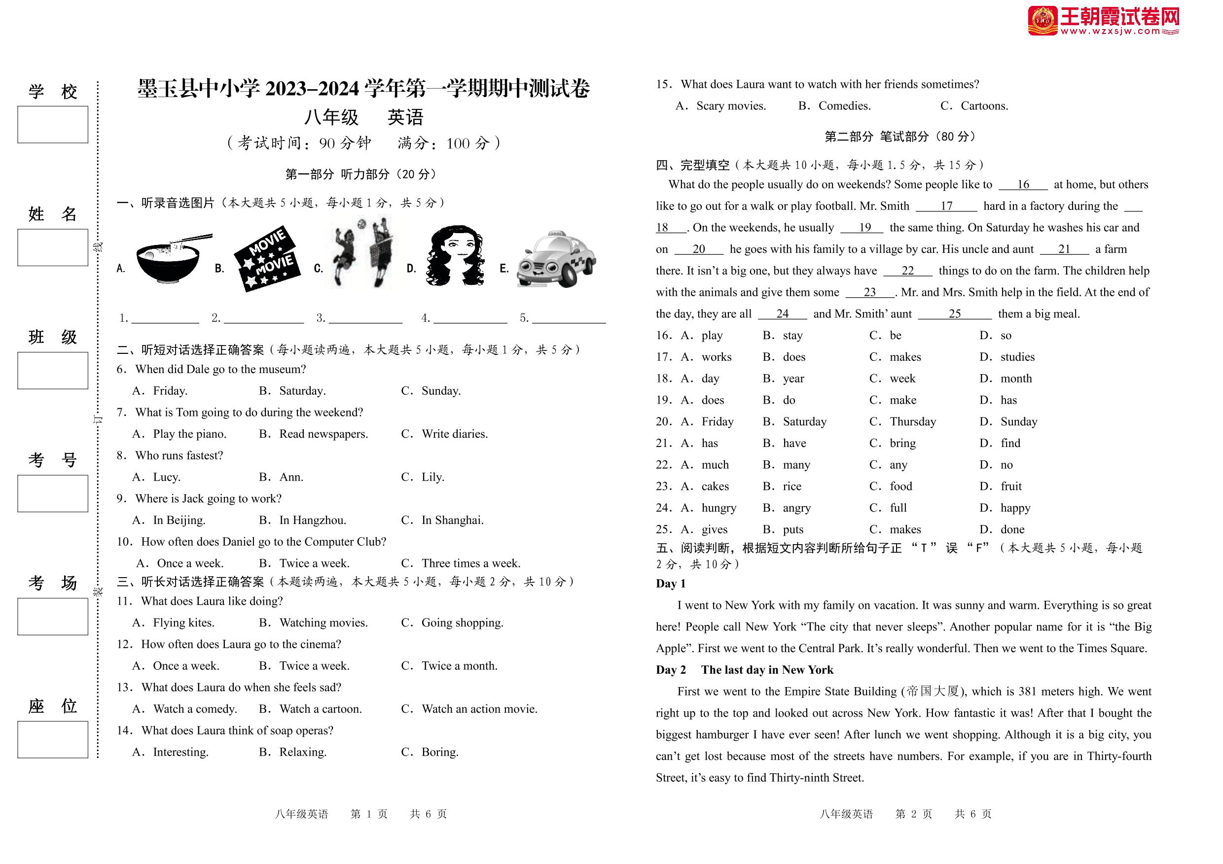 新疆维吾尔自治区和田地区墨玉县2023-2024学年第一学期期中测试卷八年级英语(人教版)【无听力音频】