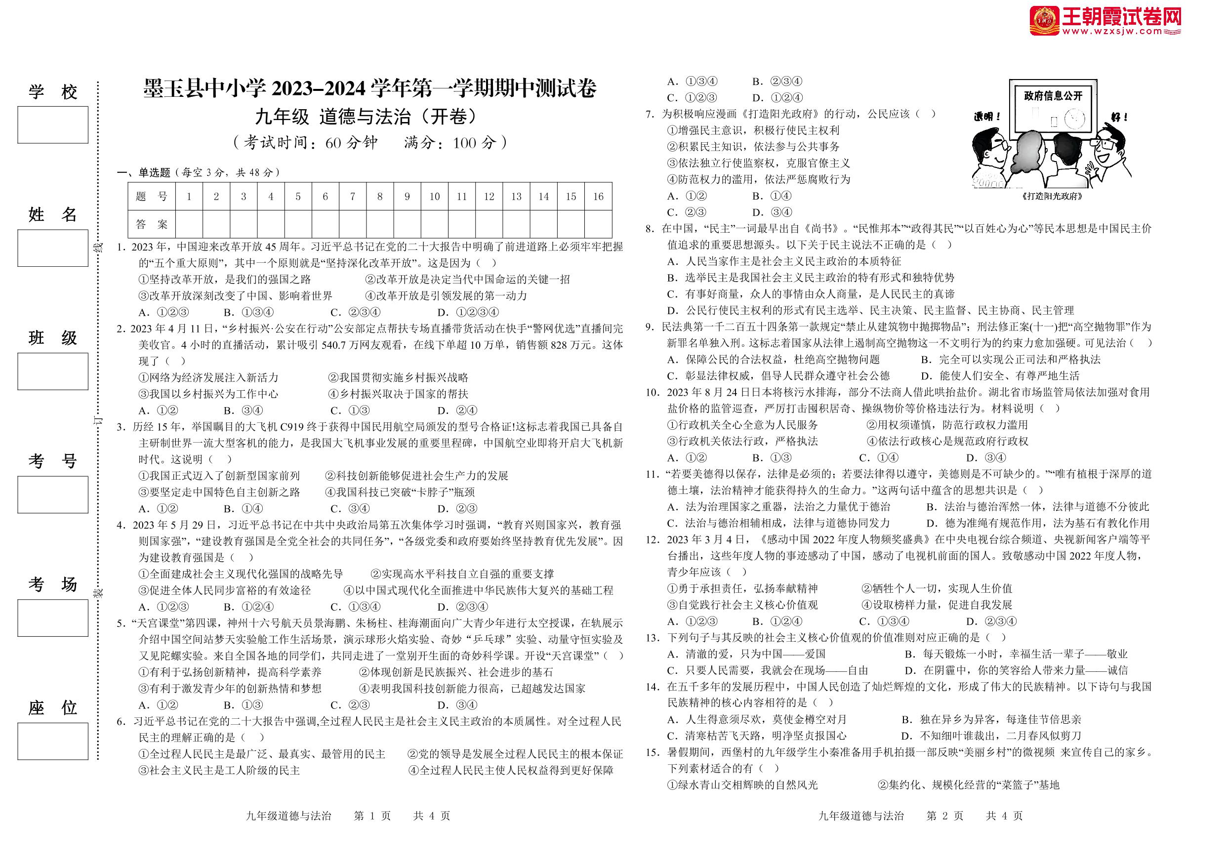新疆维吾尔自治区和田地区墨玉县2023-2024学年第一学期期中测试卷九年级道德与法治(人教版)