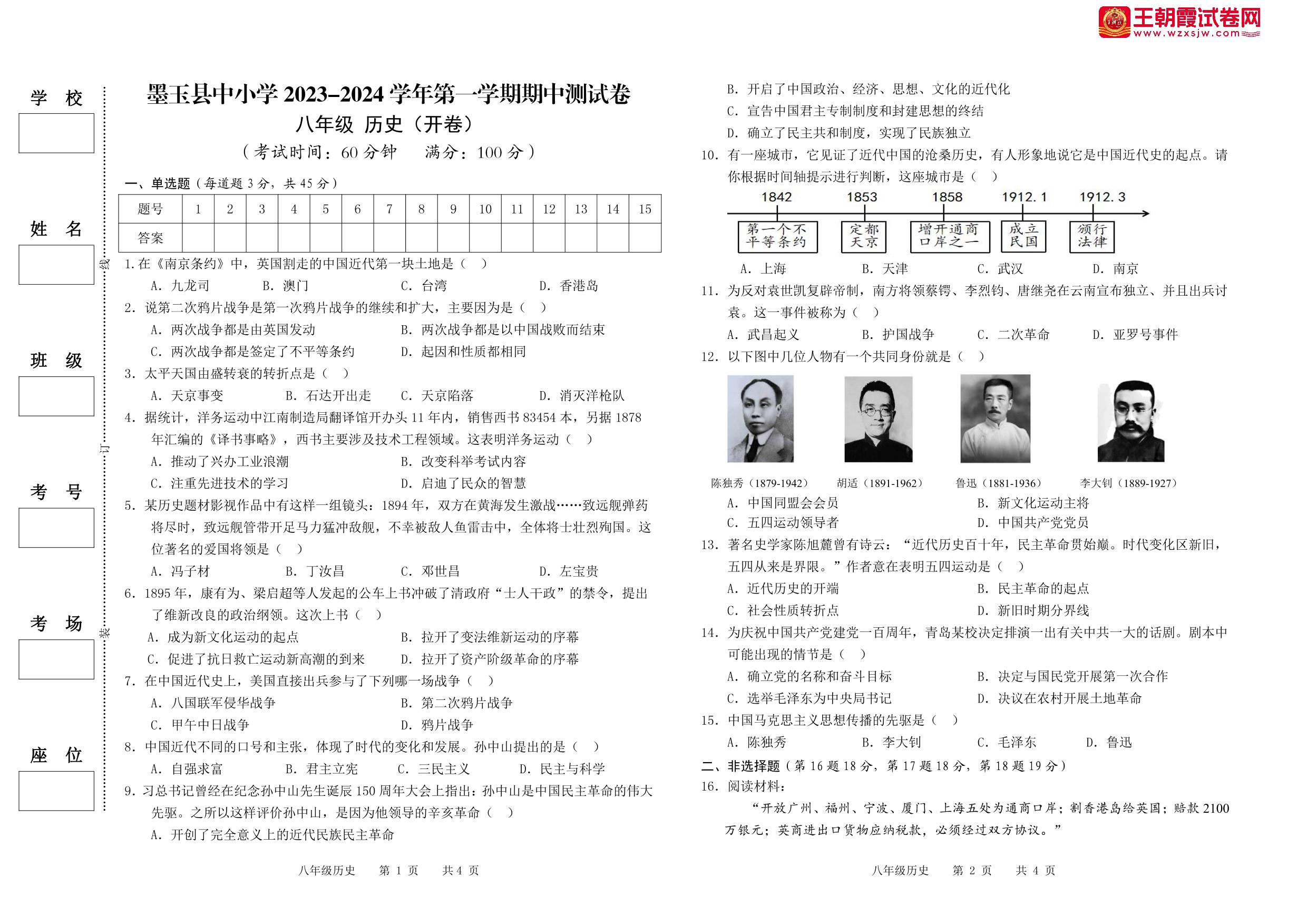 新疆维吾尔自治区和田地区墨玉县2023-2024学年第一学期期中测试卷八年级历史(人教版)