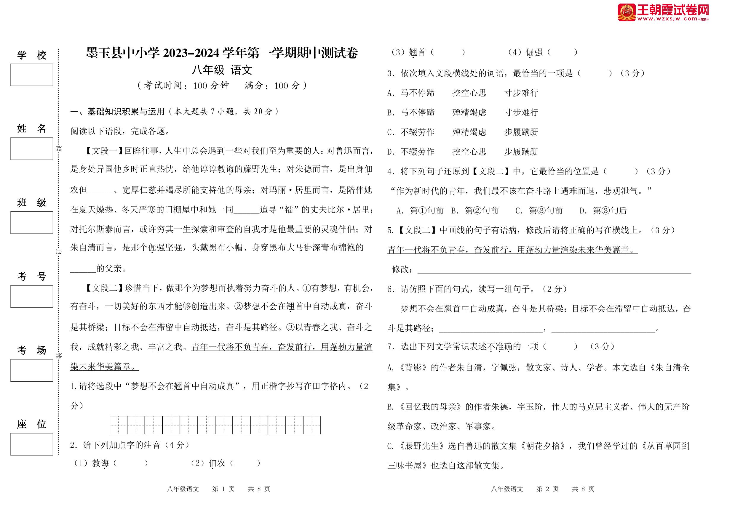 新疆维吾尔自治区和田地区墨玉县2023-2024学年第一学期期中测试卷八年级语文(人教版)