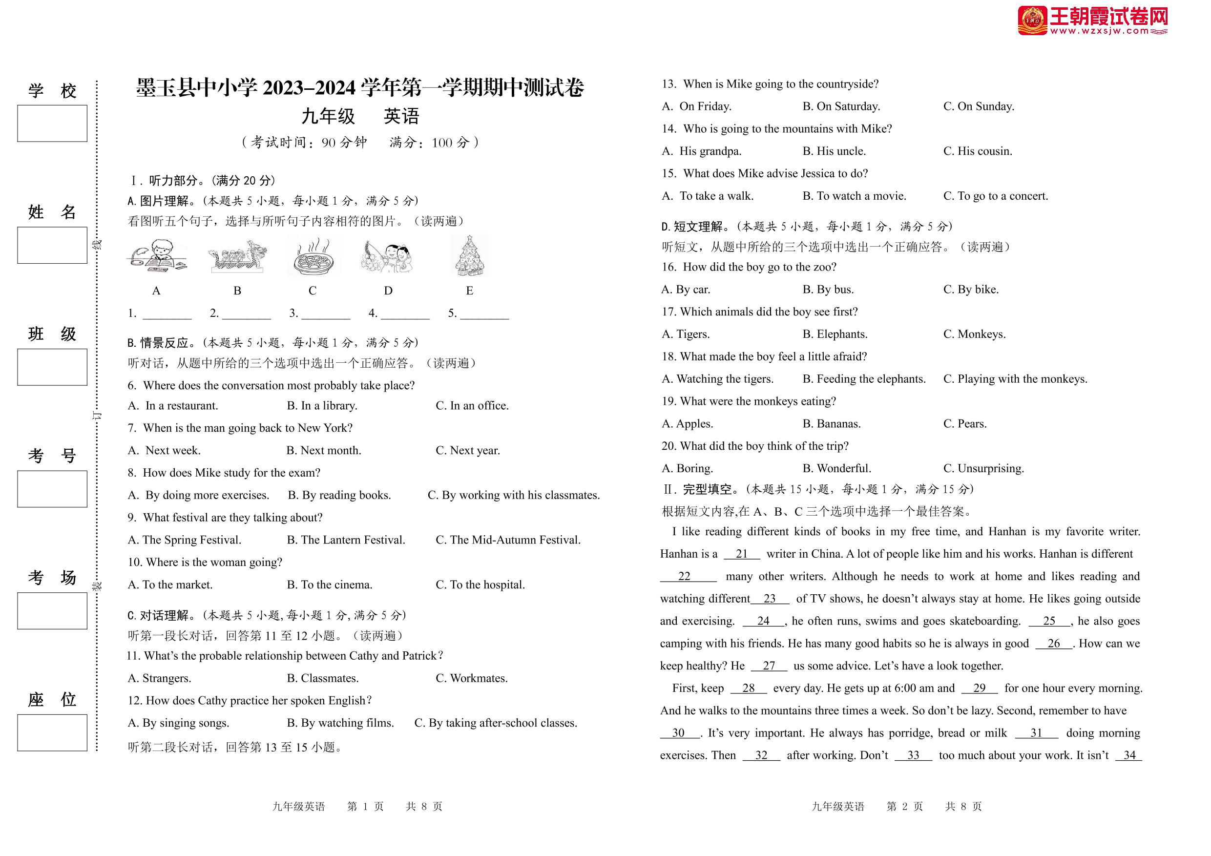 新疆维吾尔自治区和田地区墨玉县2023-2024学年第一学期期中测试卷九年级英语(人教版)【无听力音频】