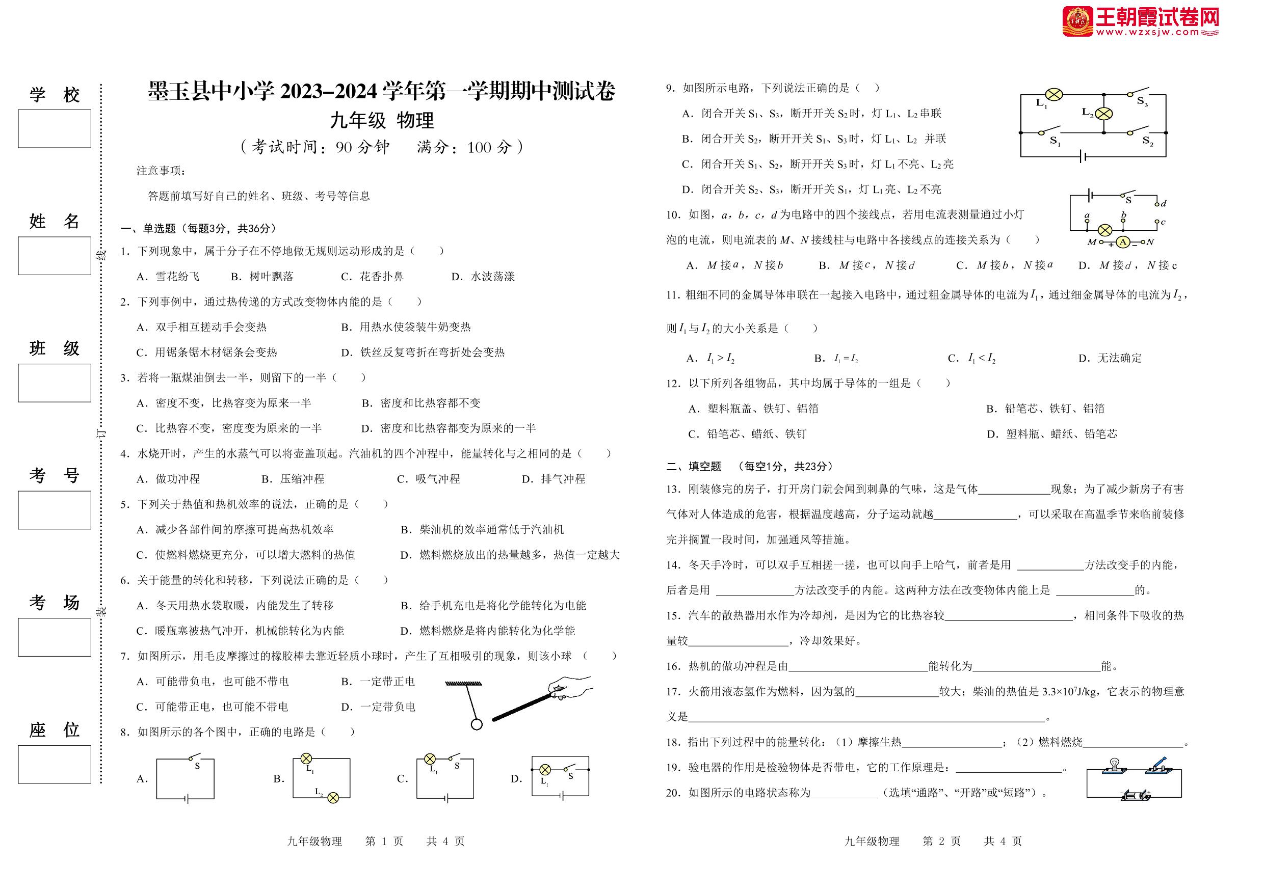 新疆维吾尔自治区和田地区墨玉县2023-2024学年第一学期期中测试卷九年级物理(人教版)