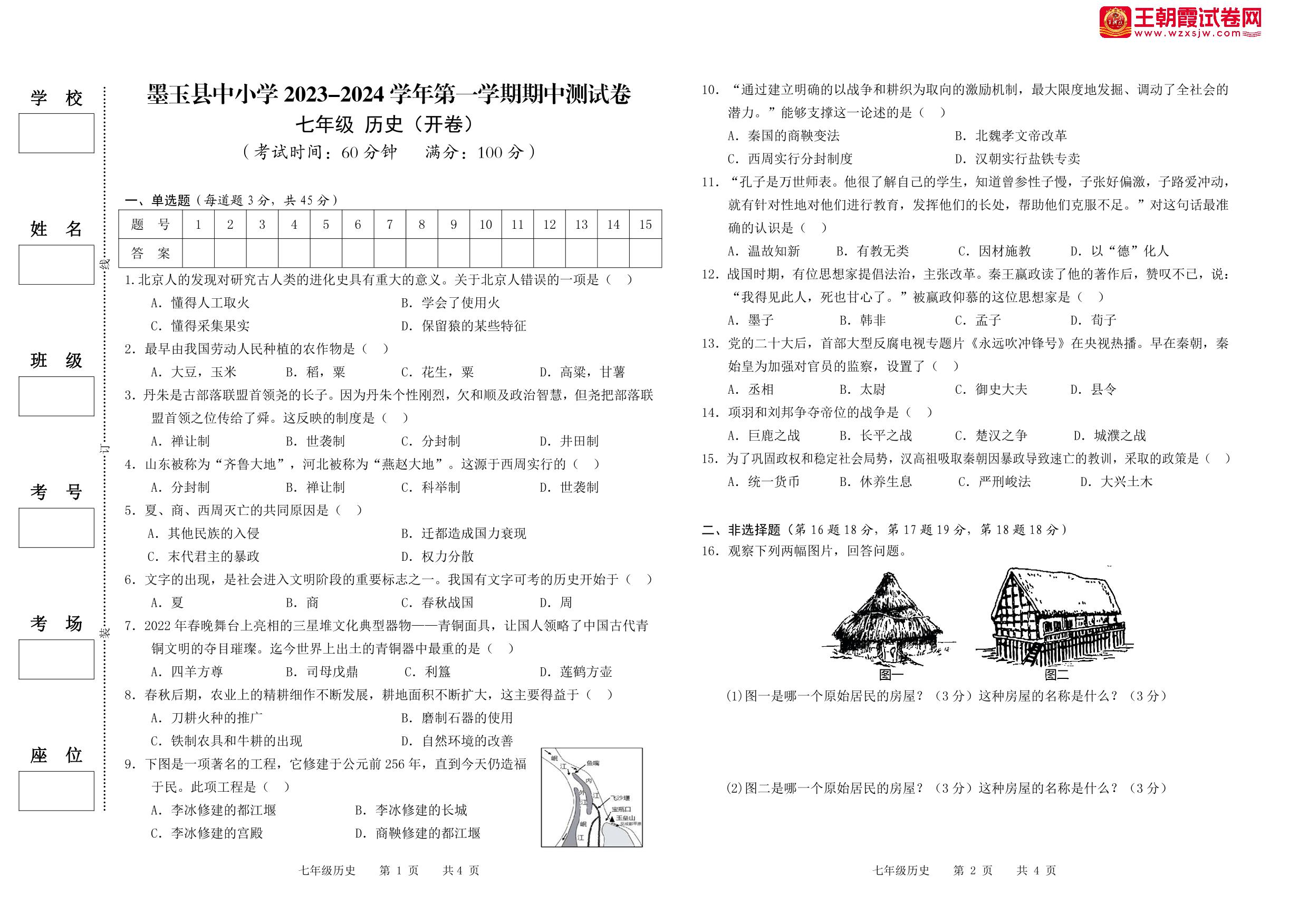 新疆维吾尔自治区和田地区墨玉县2023-2024学年第一学期期中测试卷七年级历史(人教版)