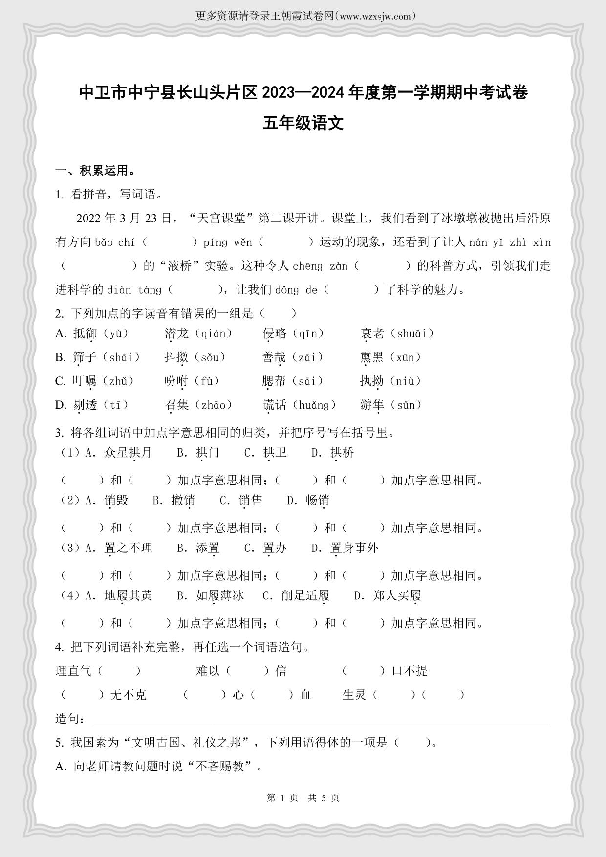宁夏中卫市中宁县长山头片区2023-2024学年度第一学期期中考试卷五年级语文(人教版)