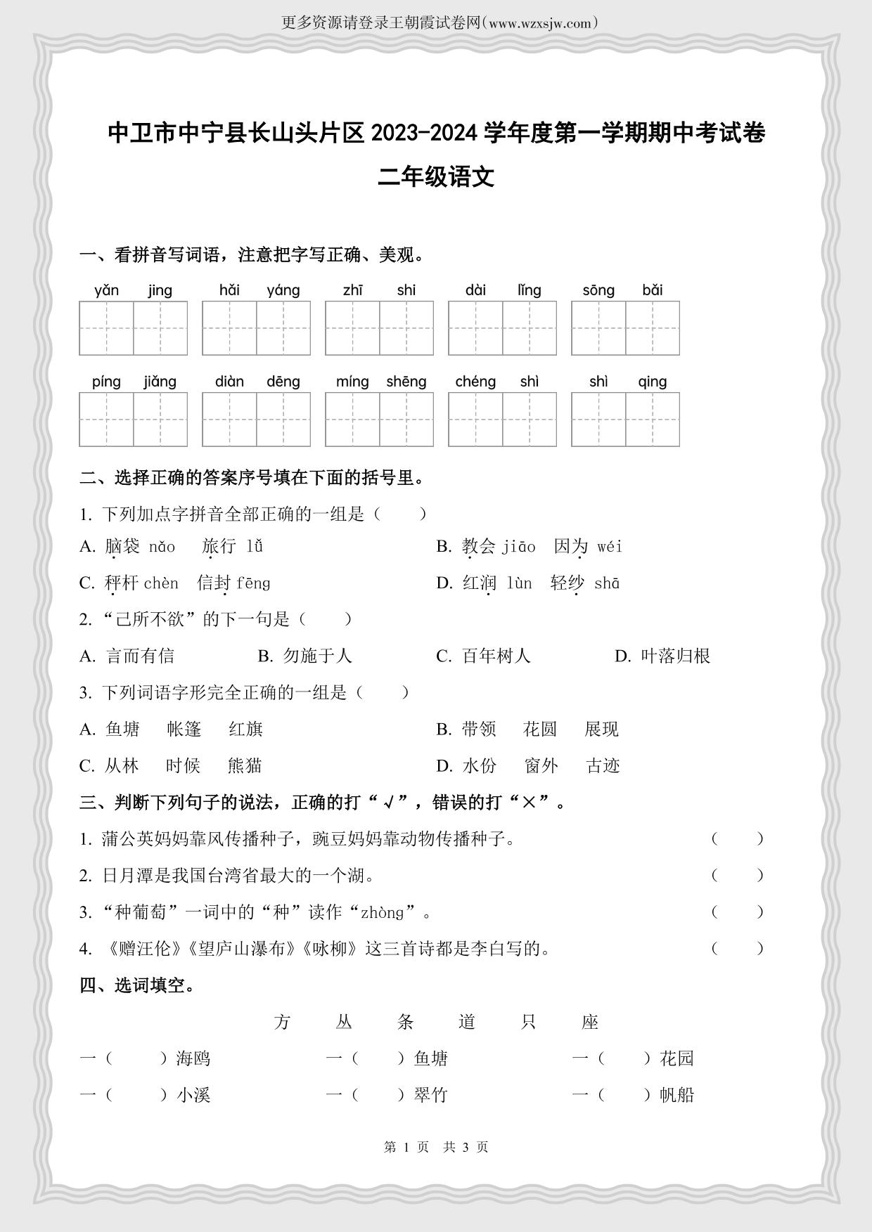 宁夏中卫市中宁县长山头片区2023-2024学年度第一学期期中考试卷二年级语文(人教版)