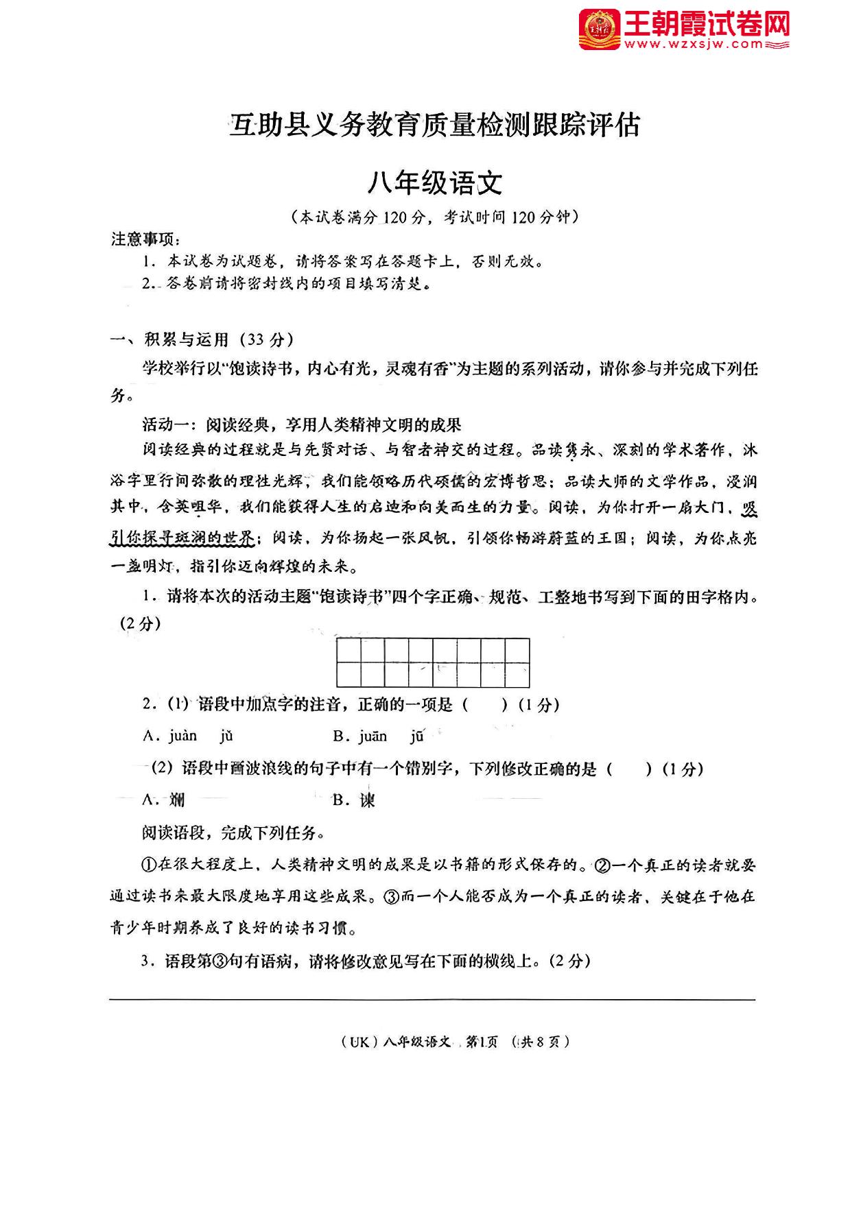 青海省海东市互助县2023-2024学年上学期期中义务教育质量检测跟踪评估八年级语文(人教版)