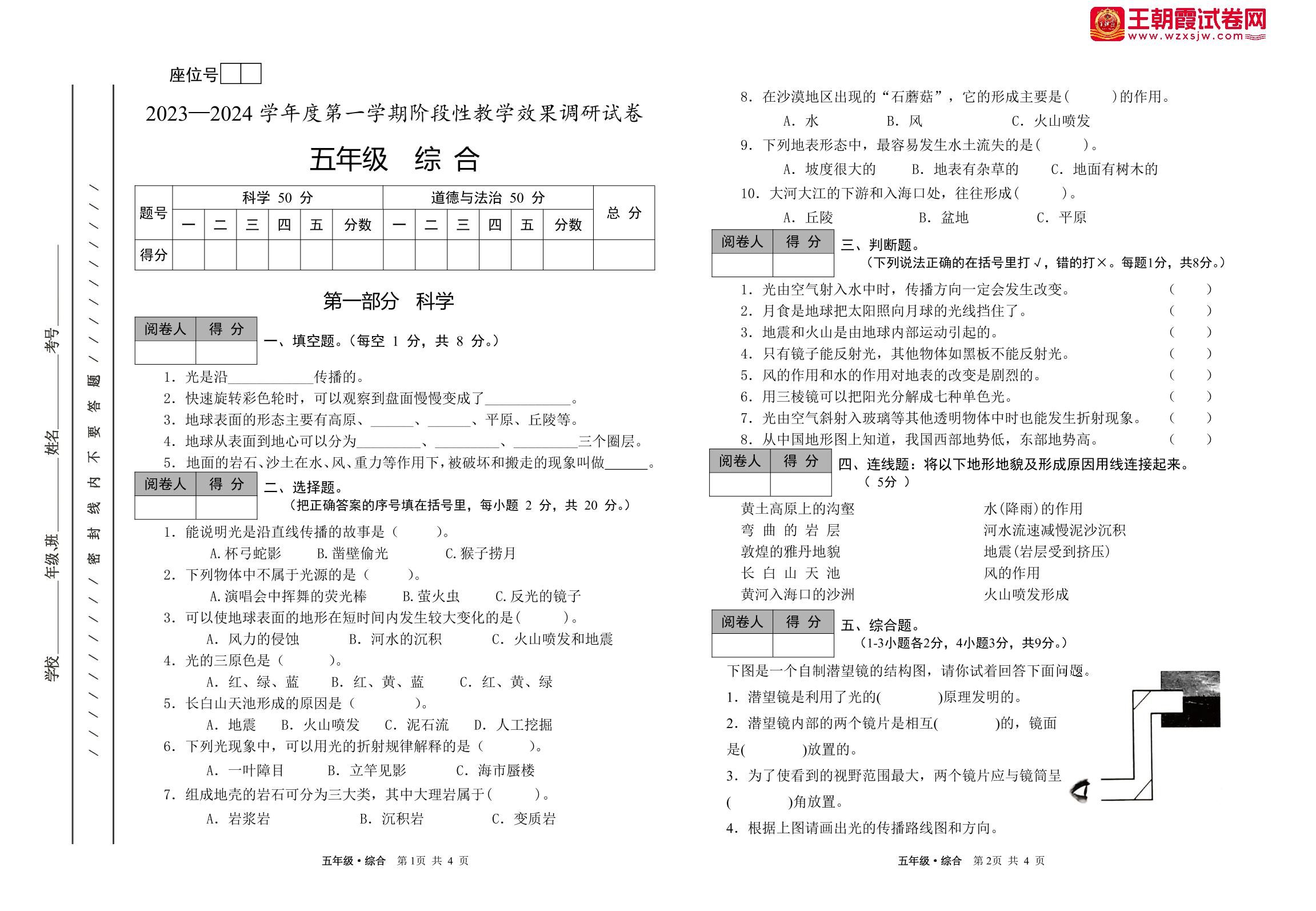 甘肃省白银市靖远县2023-2024学年度第一学期期中阶段性教学效果调研五年级科学、道德与法治综合试卷