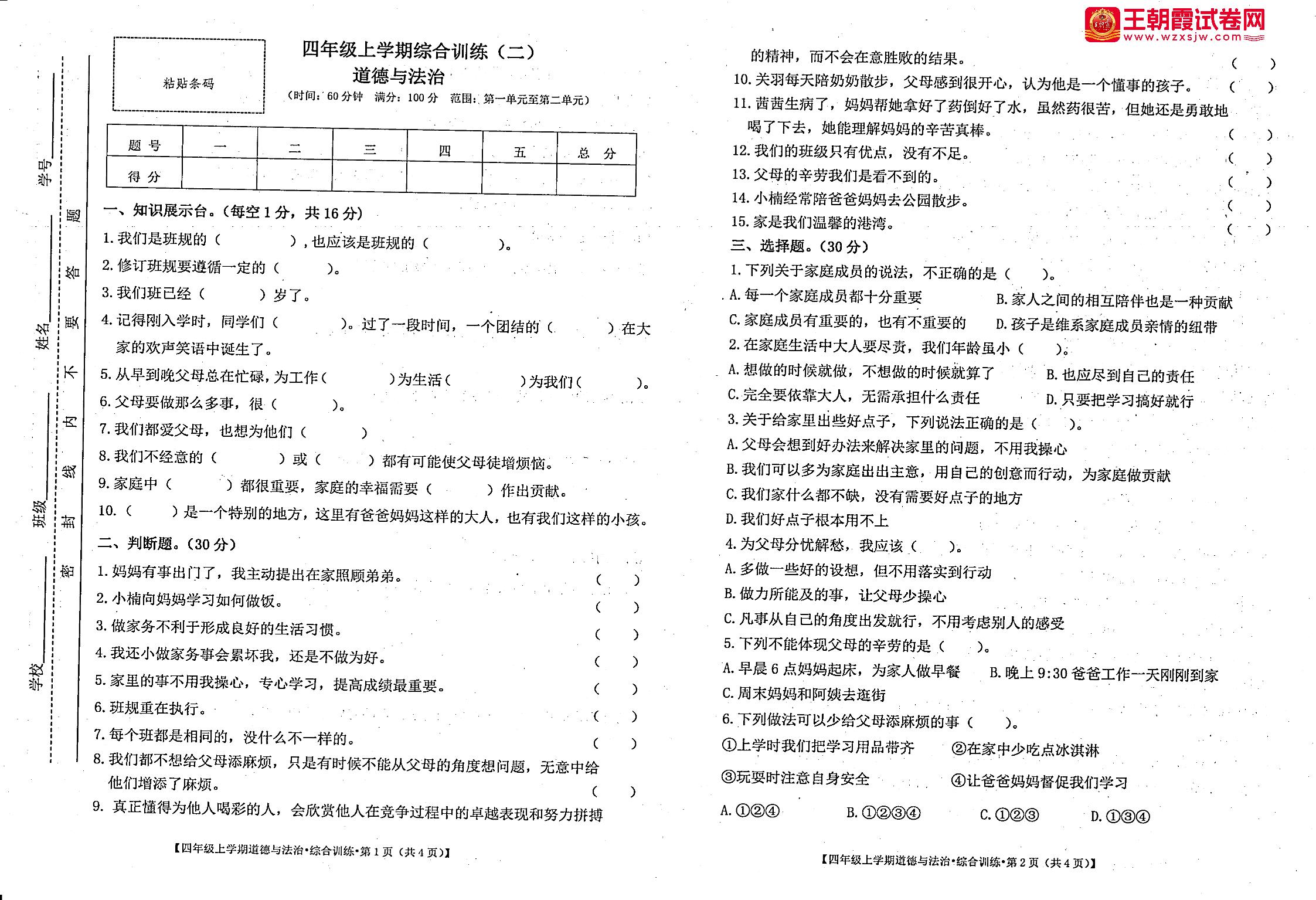 甘肃省陇南市礼县2023-2024学年上学期期中综合训练四年级道德与法治(人教版)