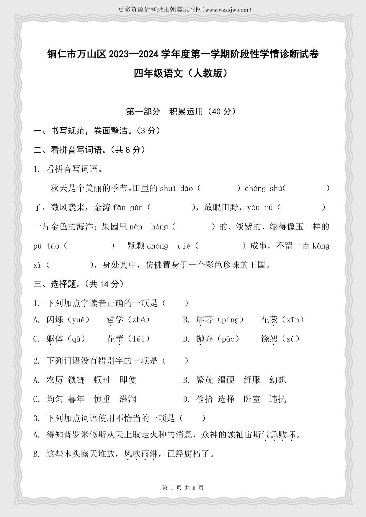 贵州省铜仁市万山区2023-2024学年度第一学期期中学情诊断试卷四年级语文(人教版)