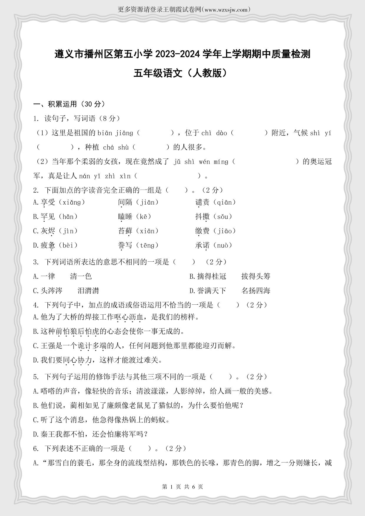 贵州省遵义市播州区第五小学2023-2024学年度第一学期期中素养检测五年级语文(人教版)