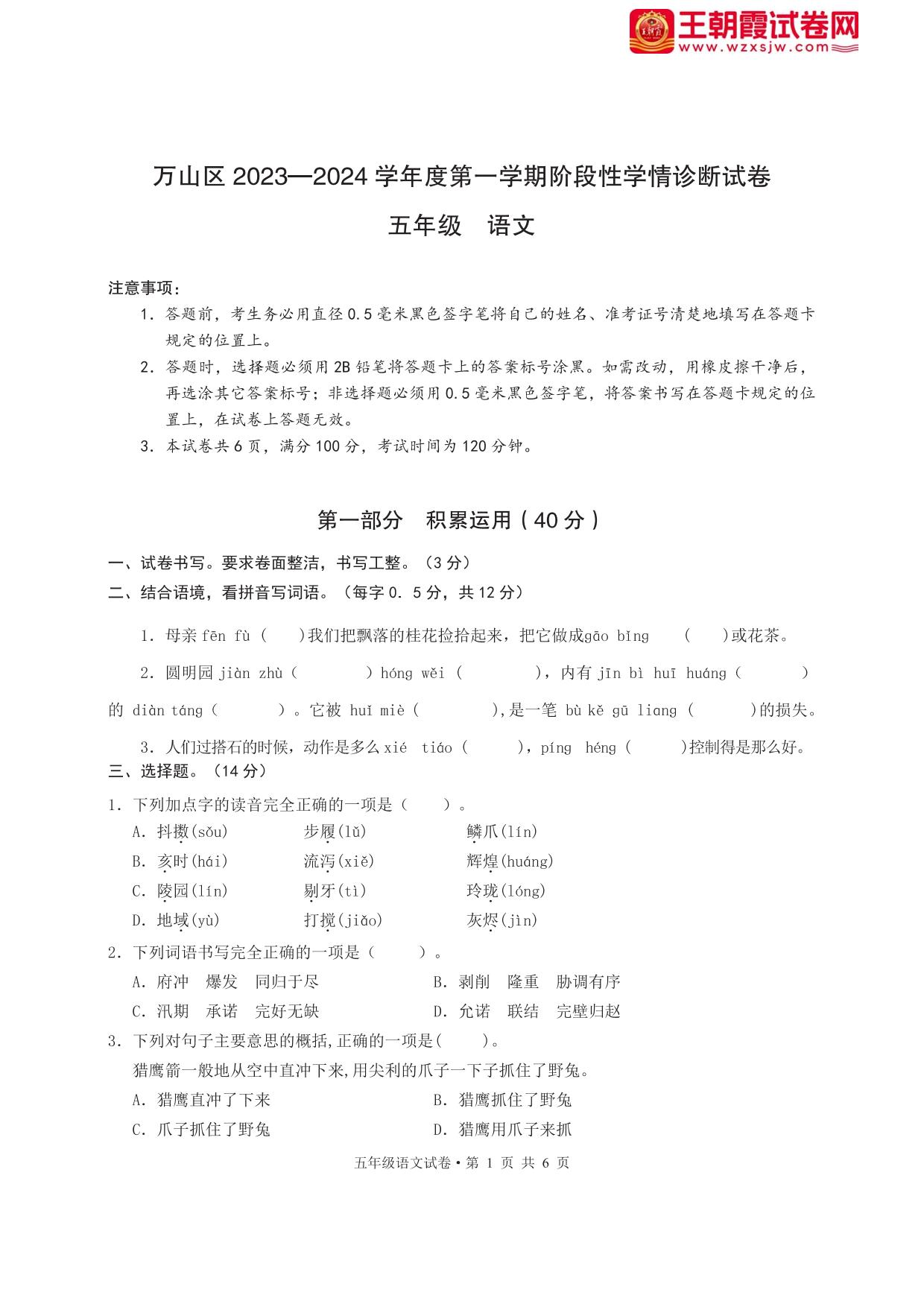 贵州省铜仁市万山区2023-2024学年度第一学期期中学情诊断试卷五年级语文(人教版)