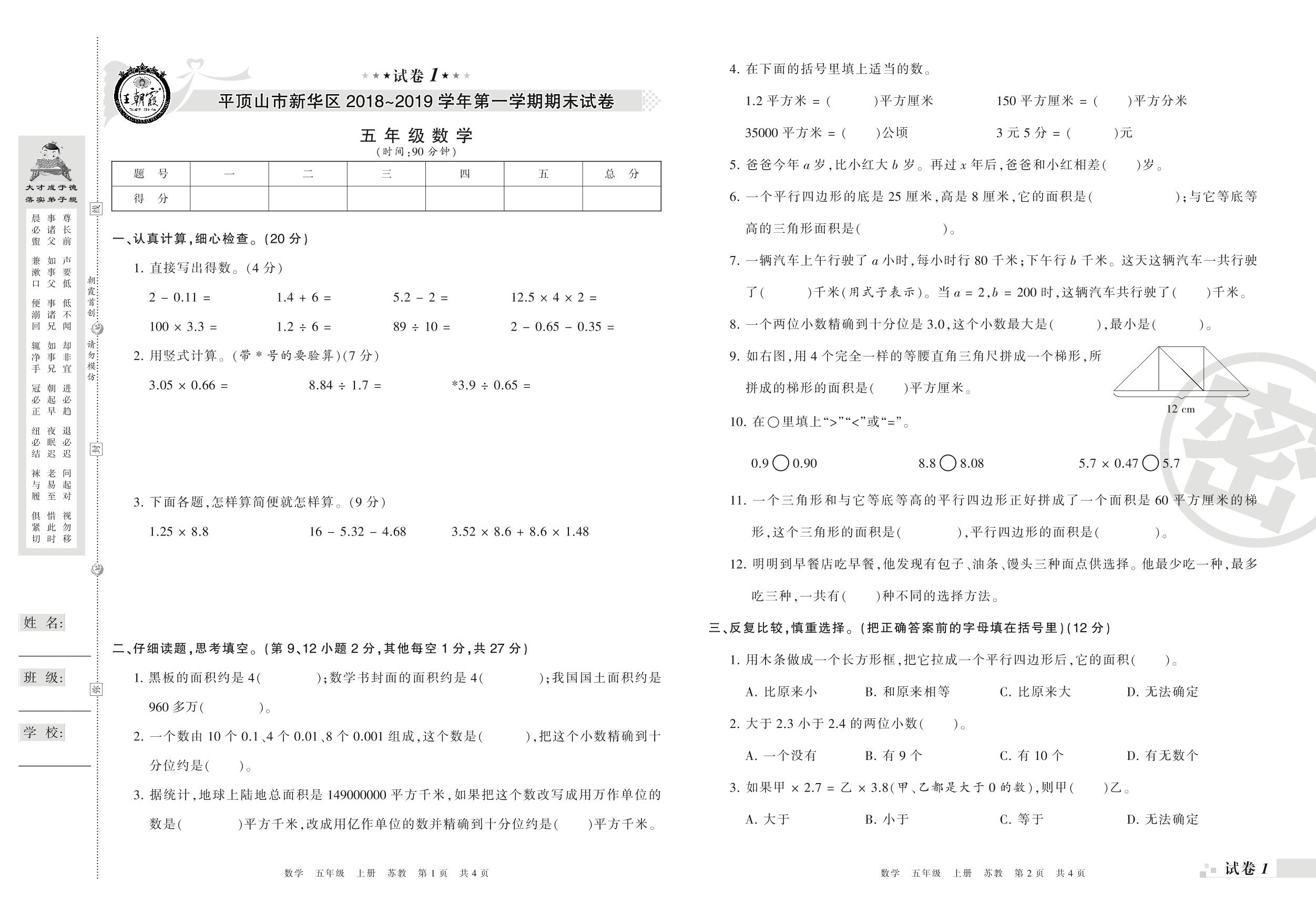 2018-2019学年第一学期平顶山市新华区五年级数学试卷(苏教版)_R210804172827【1】