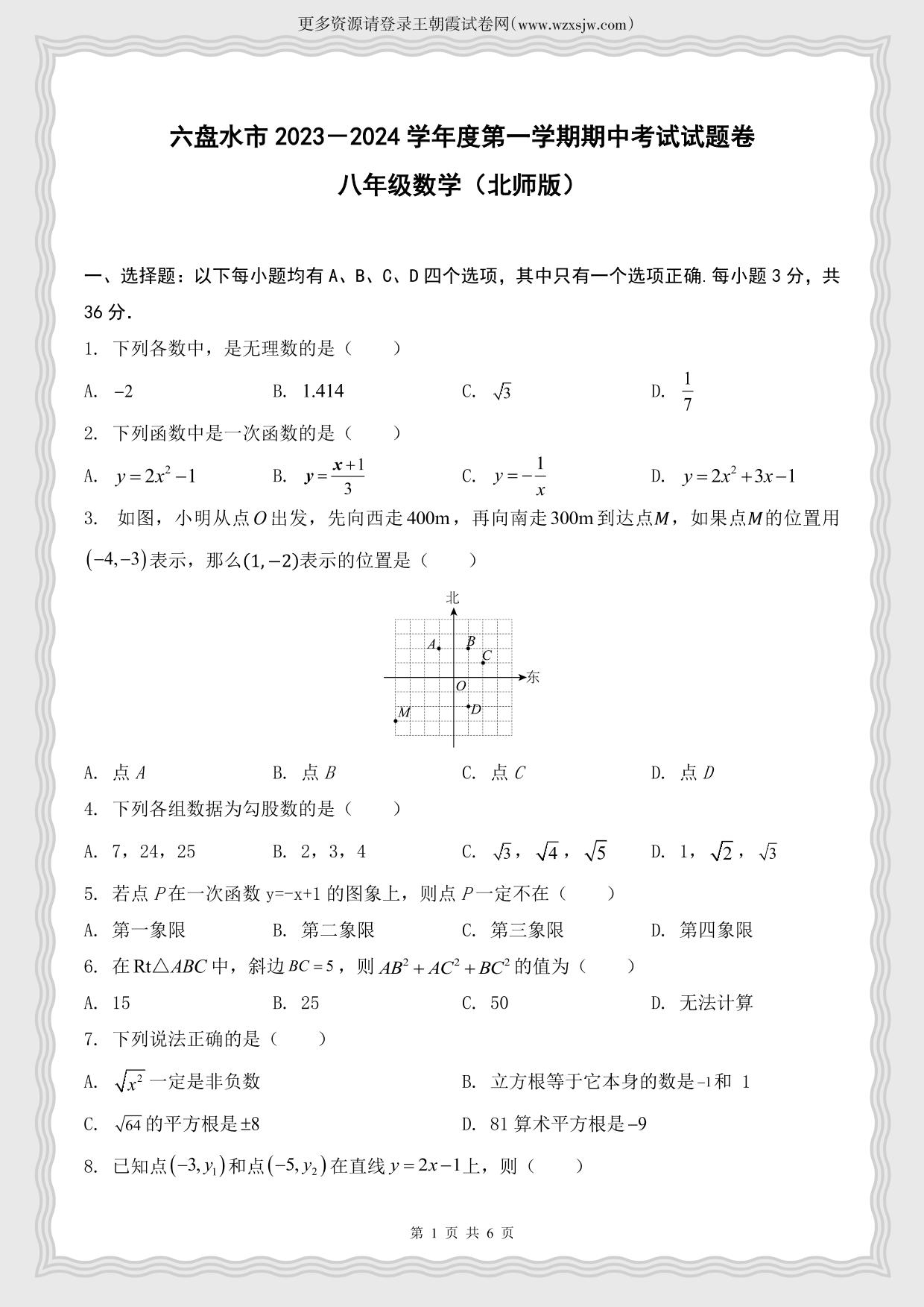 贵州省六盘水市2023-2024学年度第一学期期中考试试题卷八年级数学(北师版)
