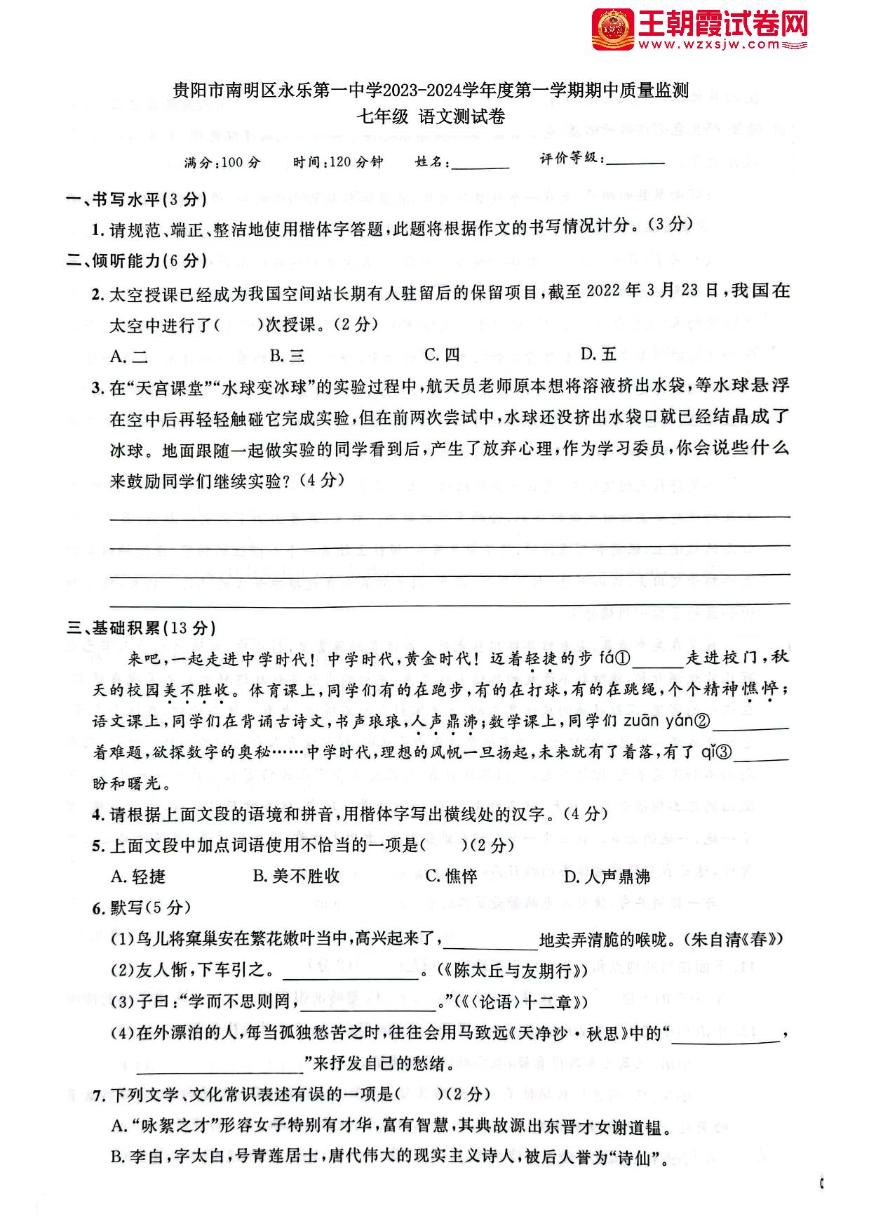 贵州省贵阳市南明区永乐第一中学2023-2024学年度第一学期期中质量监测七年级语文(人教版)