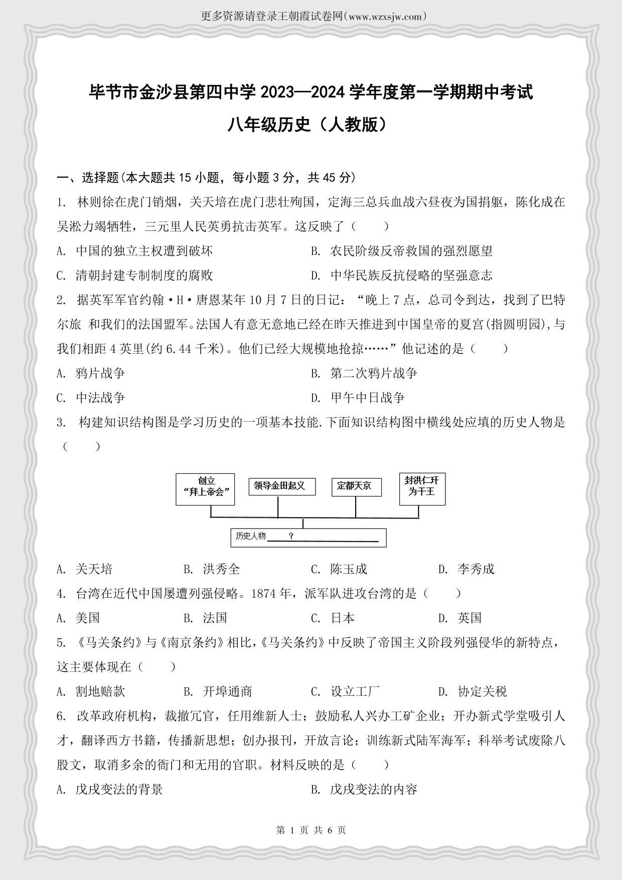 贵州省毕节市金沙县第四中学2023-2024学年度第一学期期中考试八年级历史(人教版)