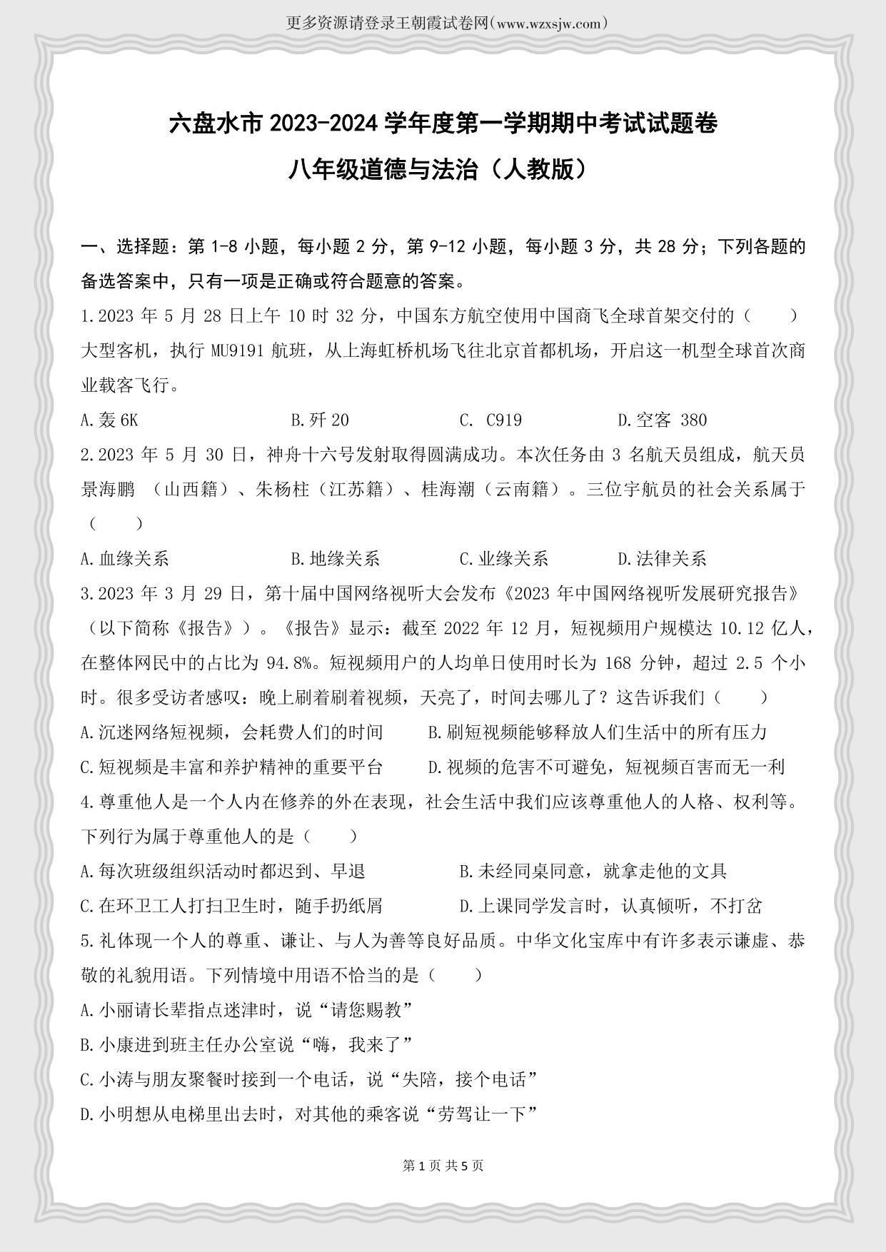 贵州省六盘水市2023-2024学年度第一学期期中考试试题八年级道德与法治(人教版)