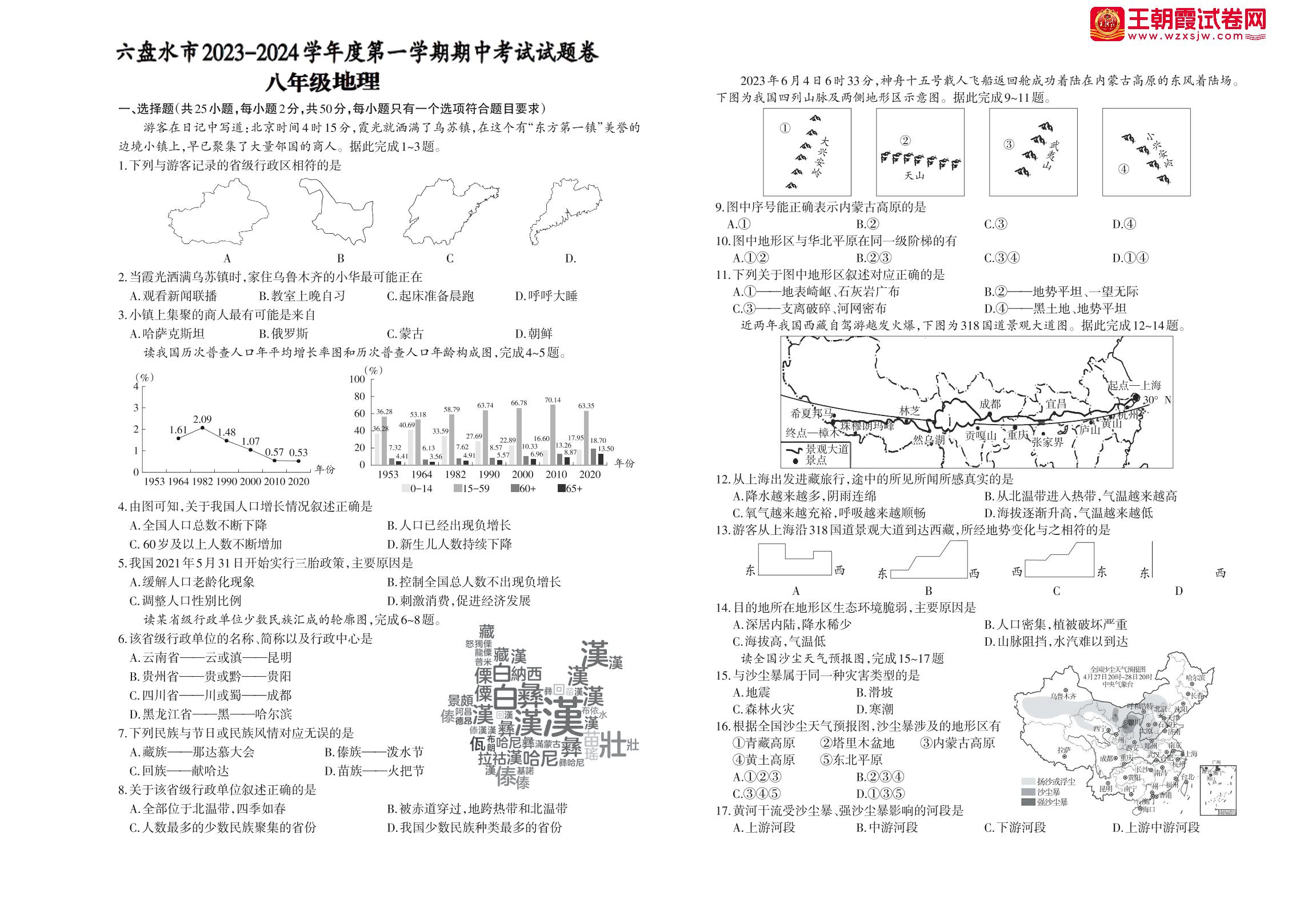 贵州省六盘水市2023-2024学年度第一学期期中考试试题八年级地理(人教版)