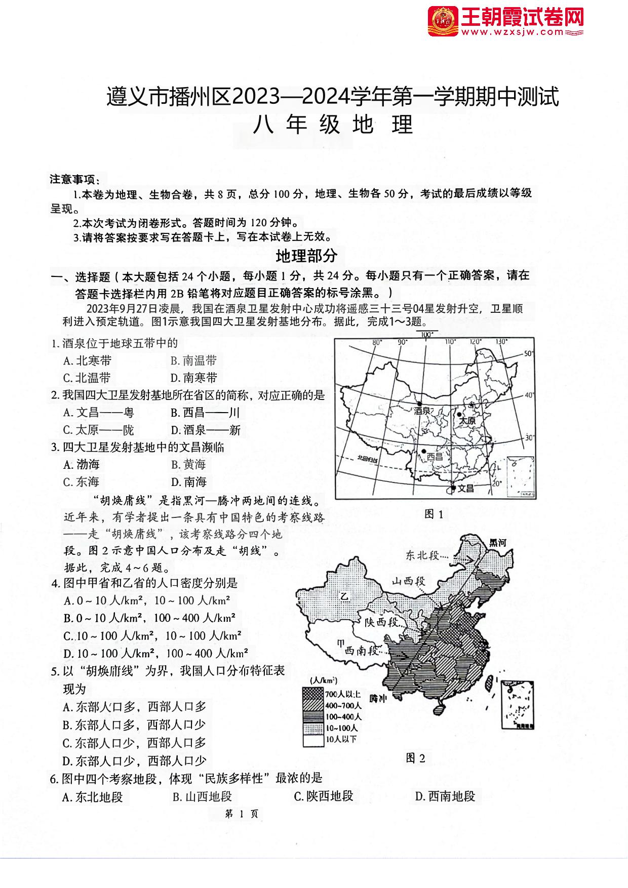 贵州省遵义市播州区2023-2024学年第一学期期中测试八年级地理(人教版)