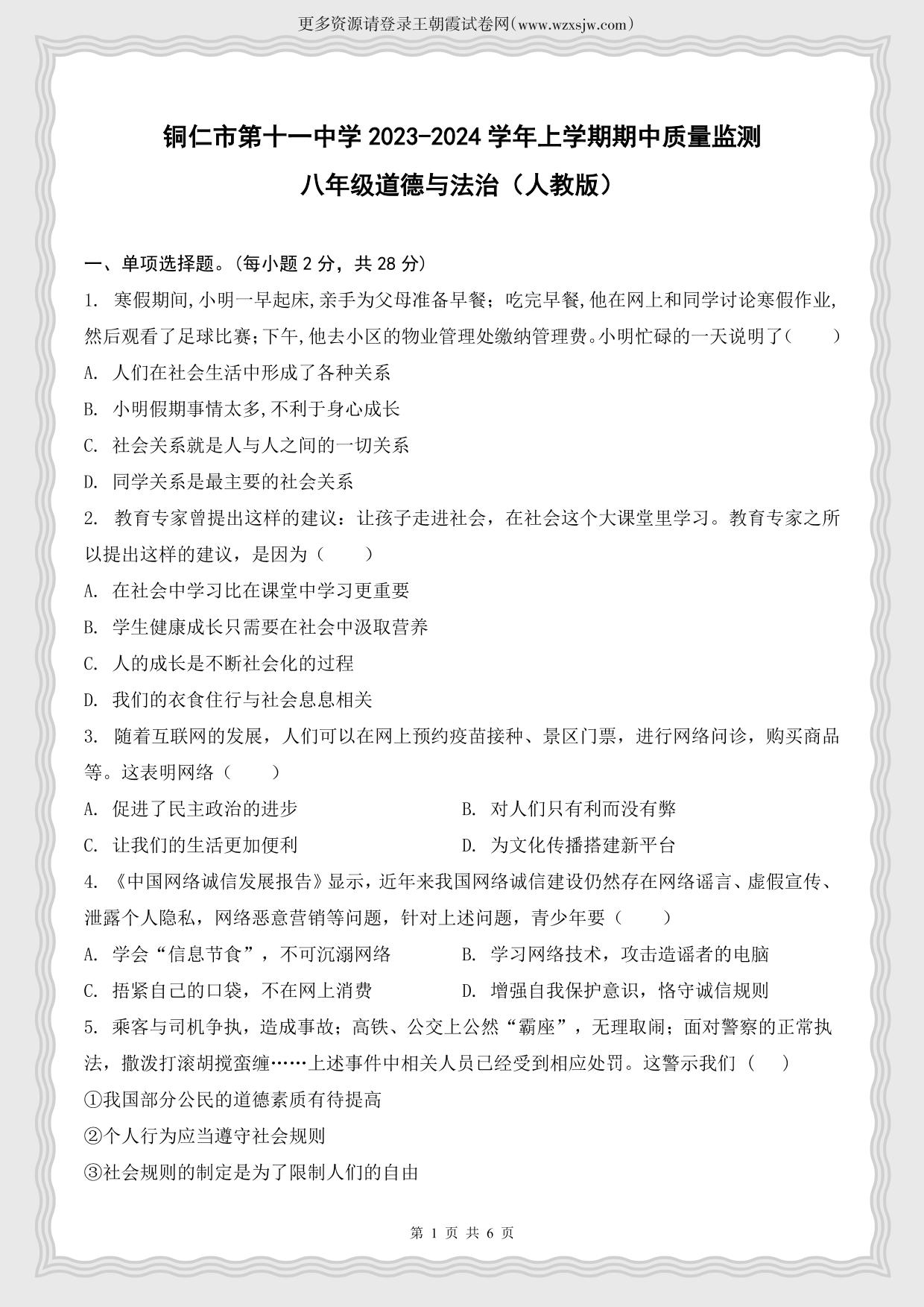 贵州省铜仁市第十一中学2023-2024学年上学期期中考试八年级道德与法治(人教版)