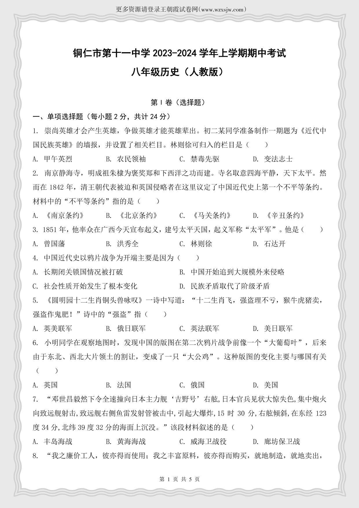 贵州省铜仁市第十一中学2023-2024学年上学期期中考试八年级历史(人教版)
