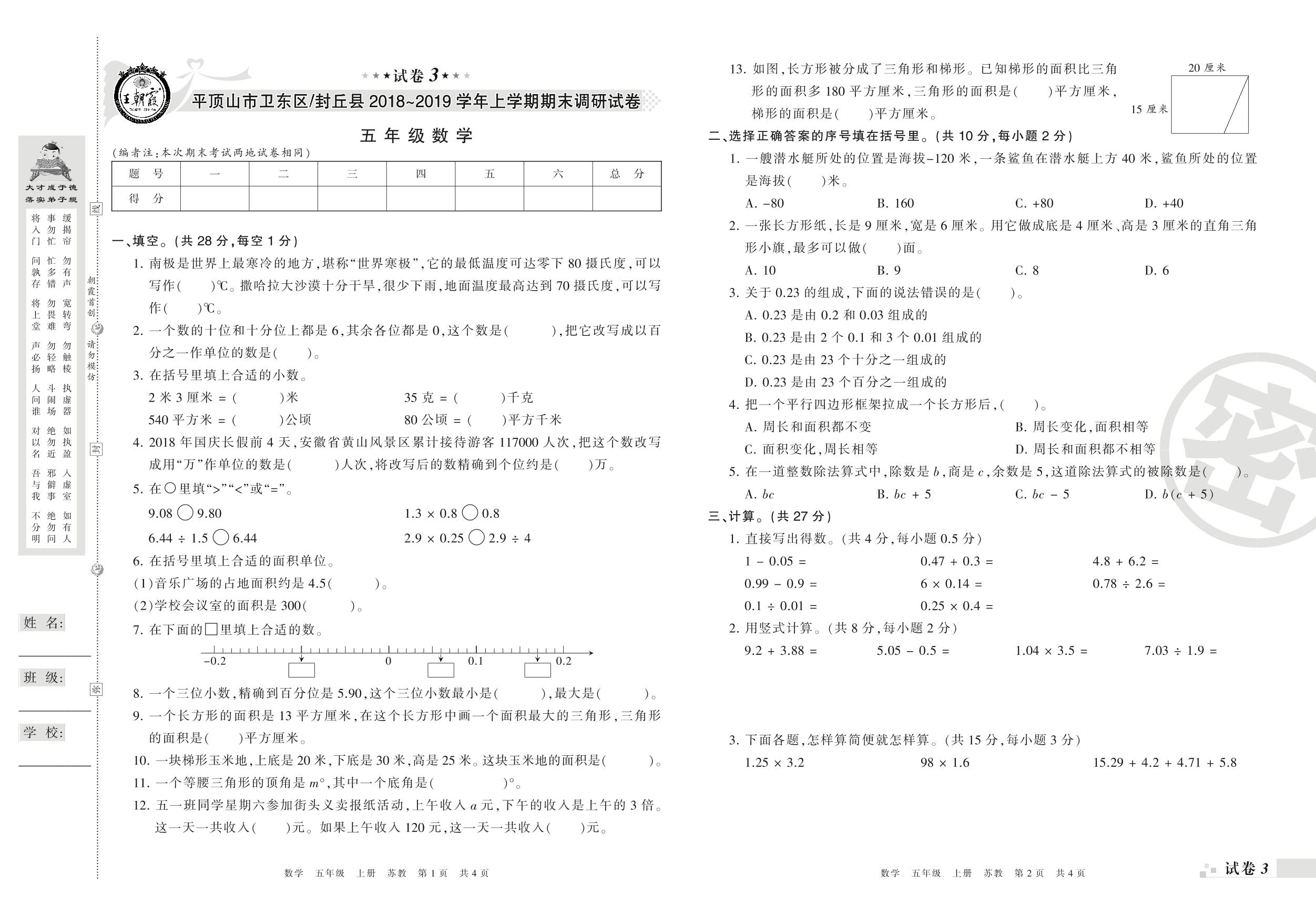 2018-2019学年第一学期平顶山市卫东区、封丘县五年级数学试卷(苏教版)【3】