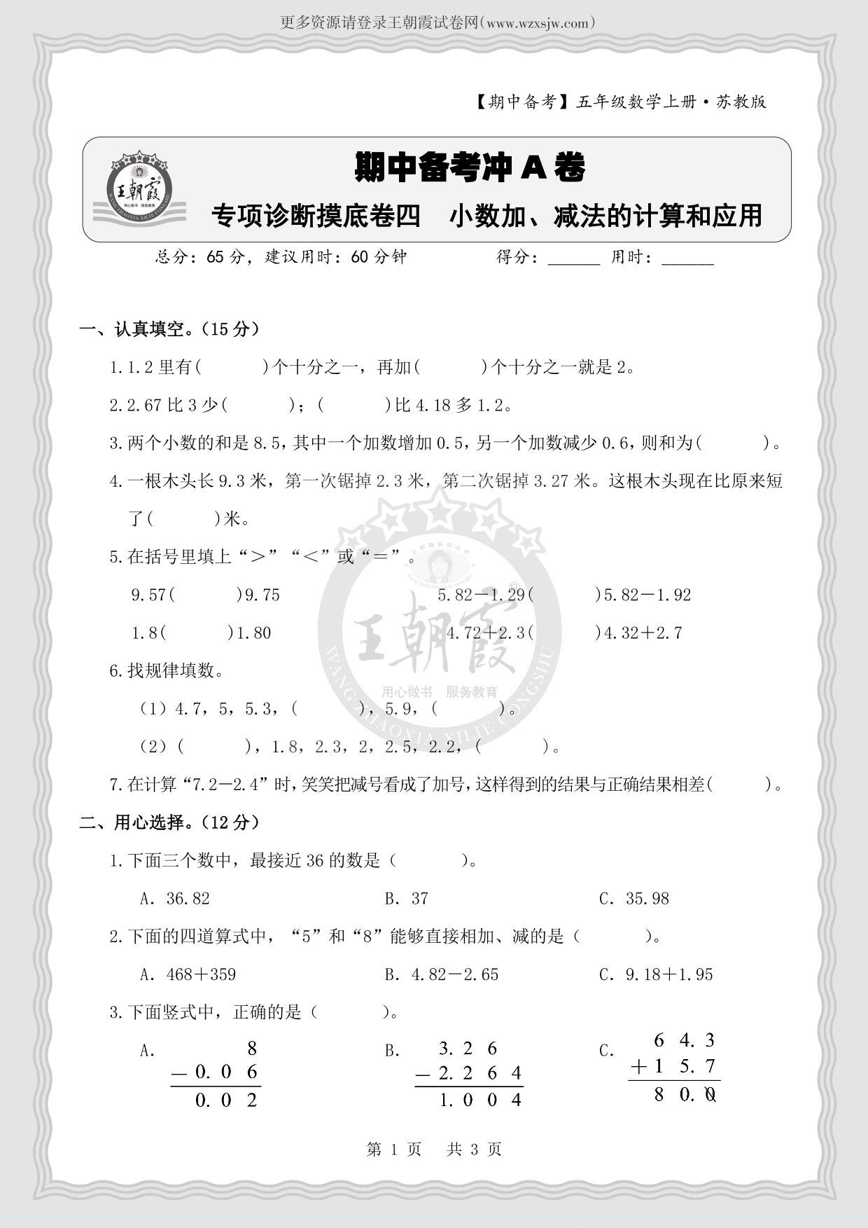 【期中备考】五年级数学上册苏教版·专项诊断摸底卷四 小数加、减法的计算和应用
