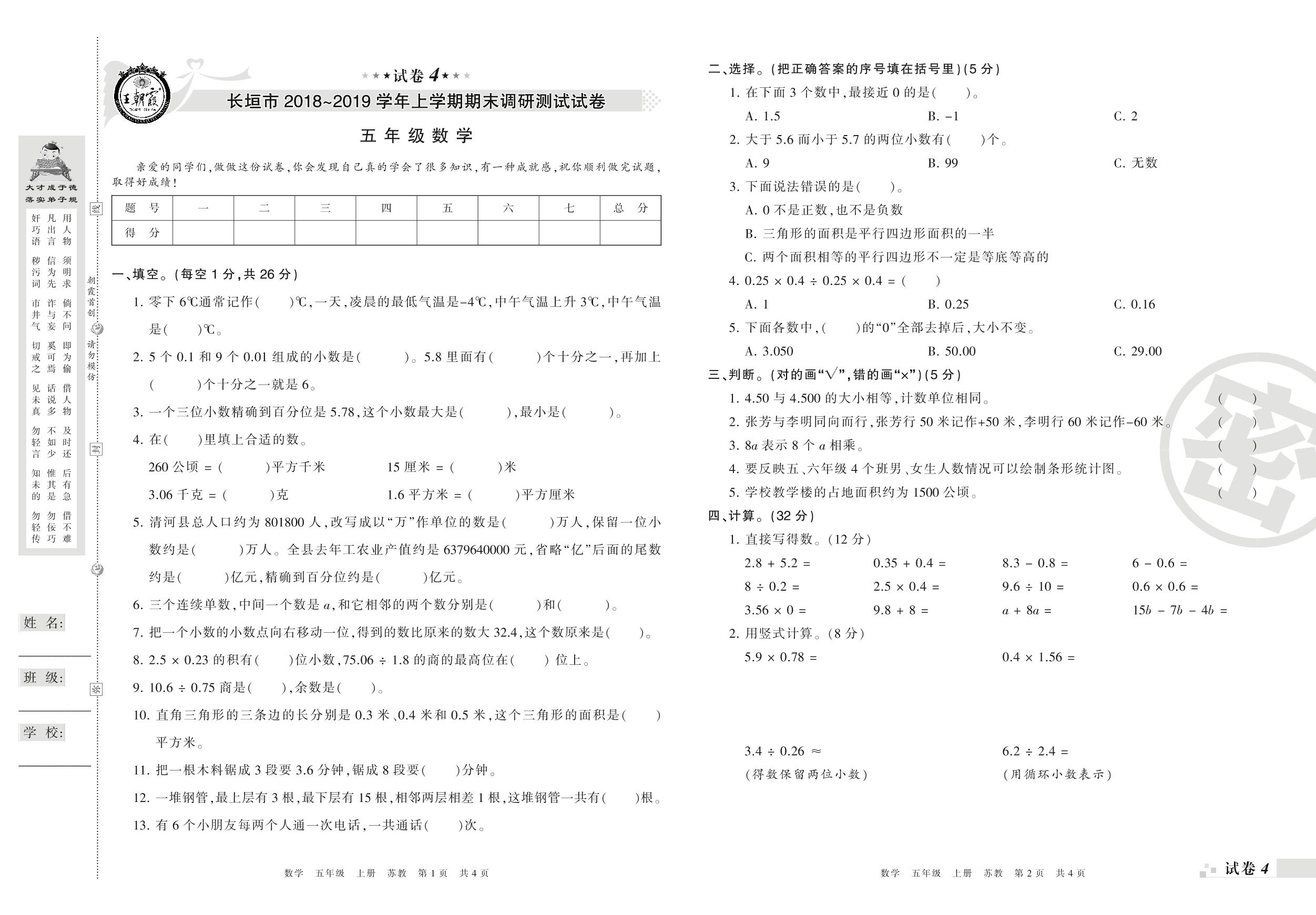 2018-2019学年第一学期长垣市五年级数学试卷(苏教版)【4】
