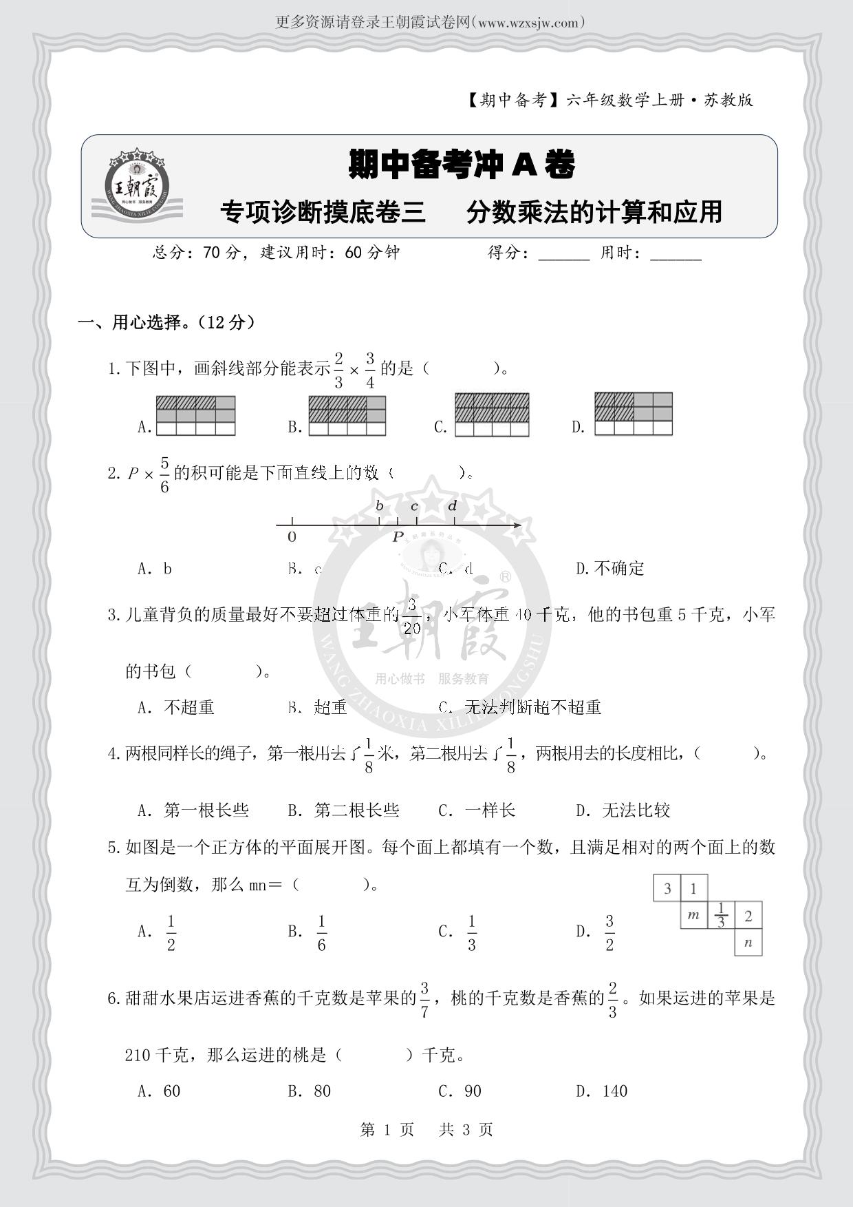 【期中备考】六年级数学上册苏教版·专项诊断摸底卷三 分数乘法的计算和应用 _R241008103132926