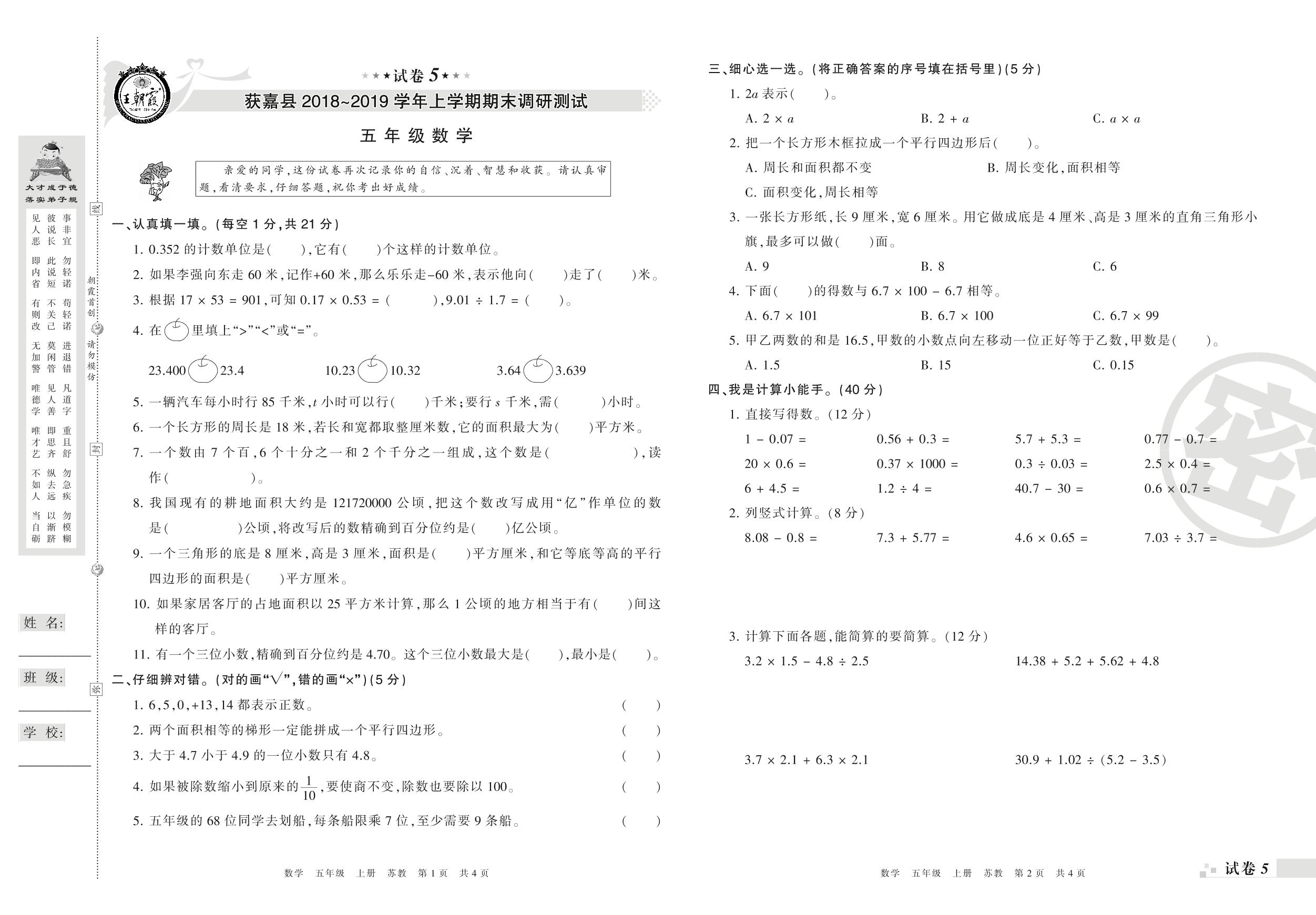 2018-2019学年第一学期新乡市获嘉县五年级数学试卷(苏教版)【5】