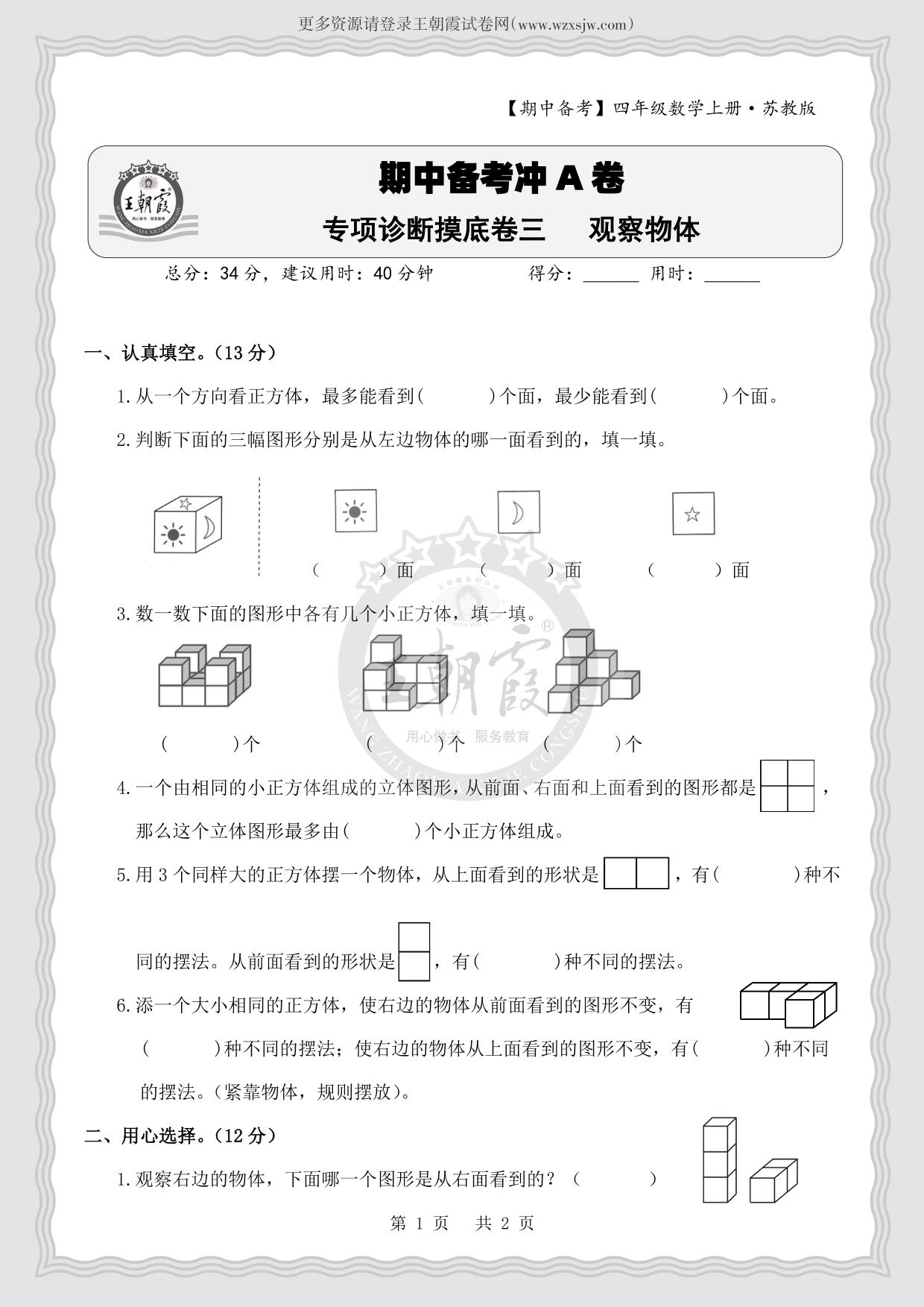 【期中备考】四年级数学上册苏教版·专项诊断摸底卷三 观察物体