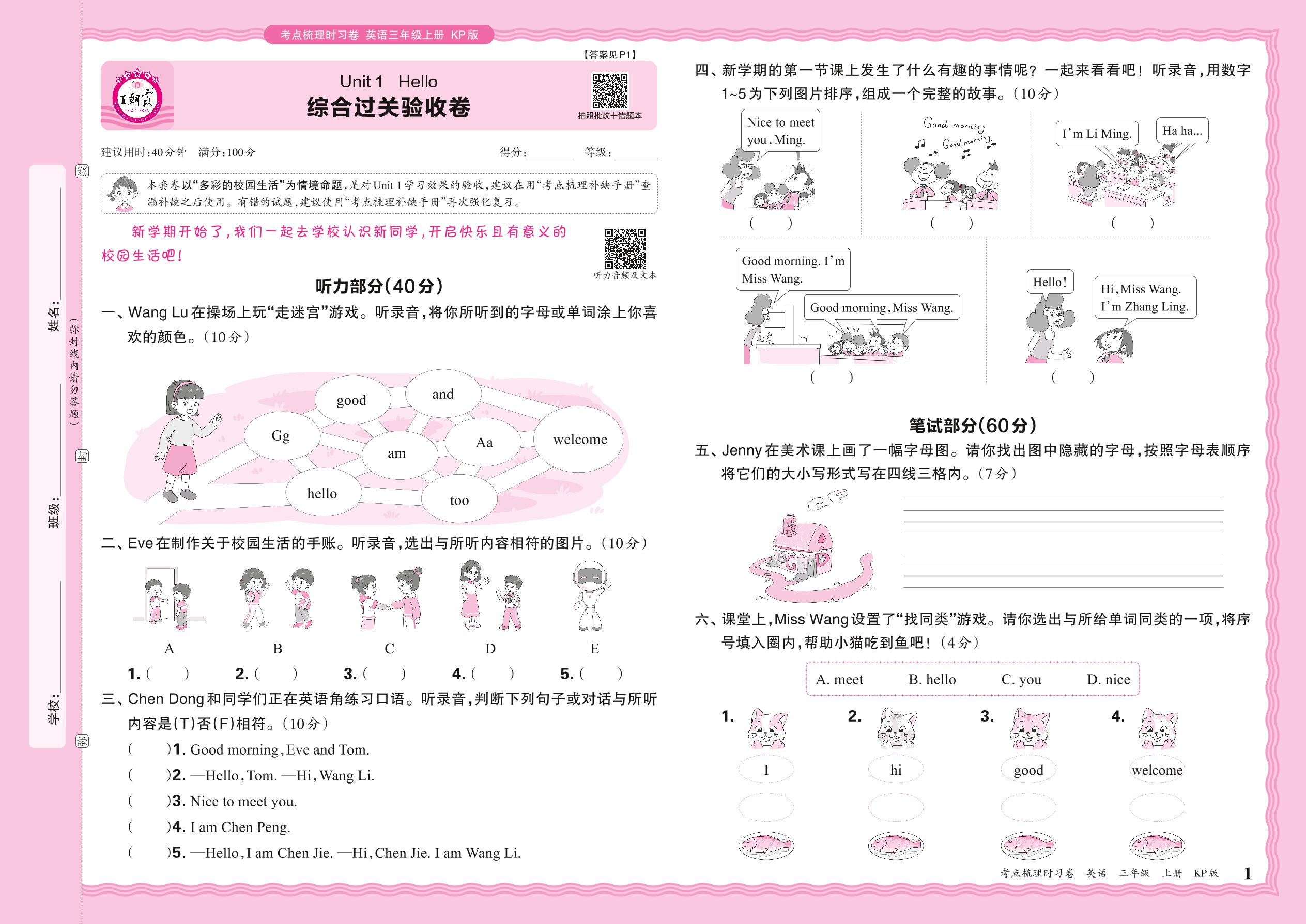 2024秋上册三年级英语科普版 Unit 1 综合过关验收卷