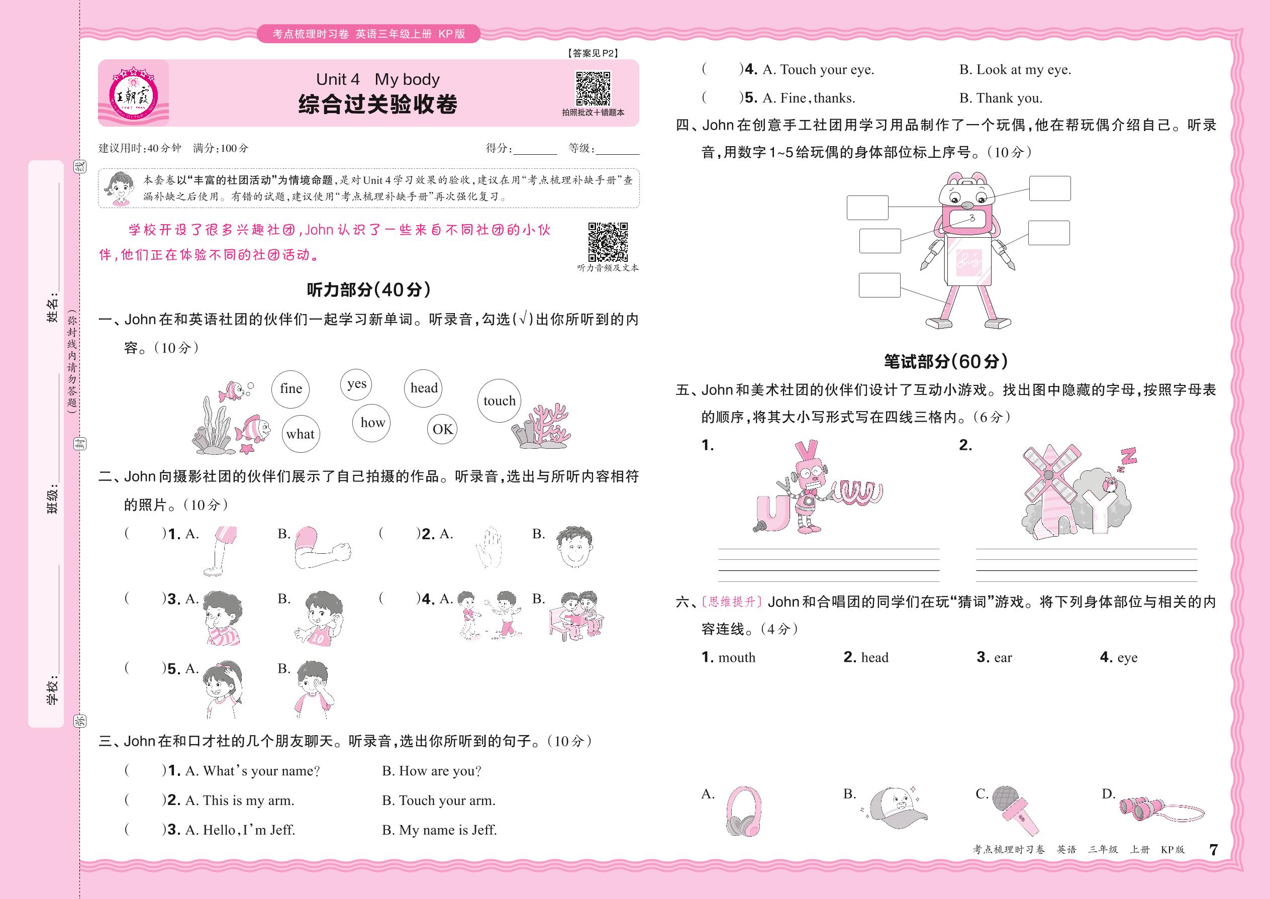 2024秋上册三年级英语科普版 Unit 4 综合过关验收卷