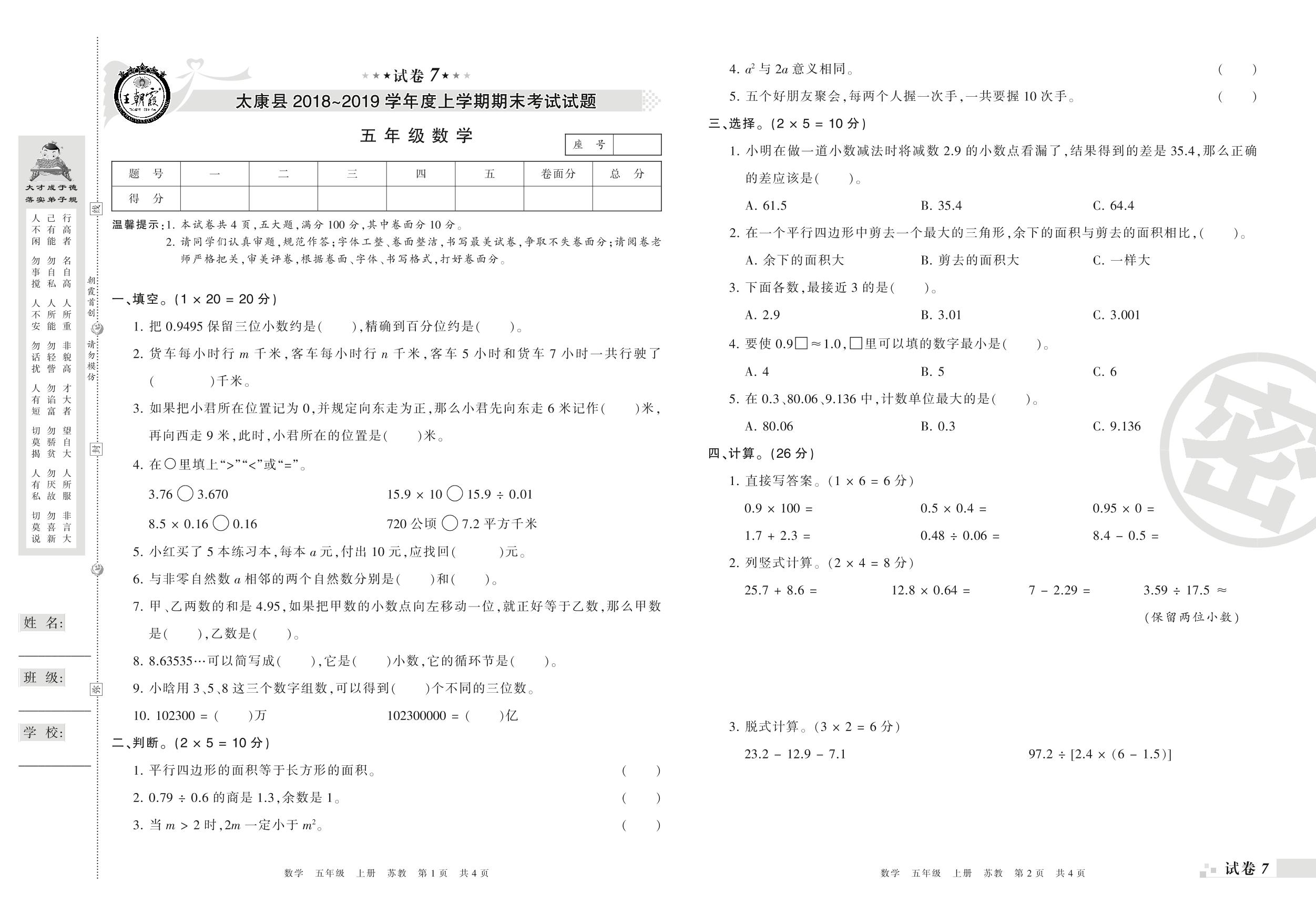 2018-2019学年第一学期周口市太康县五年级数学试卷(苏教版)【7】