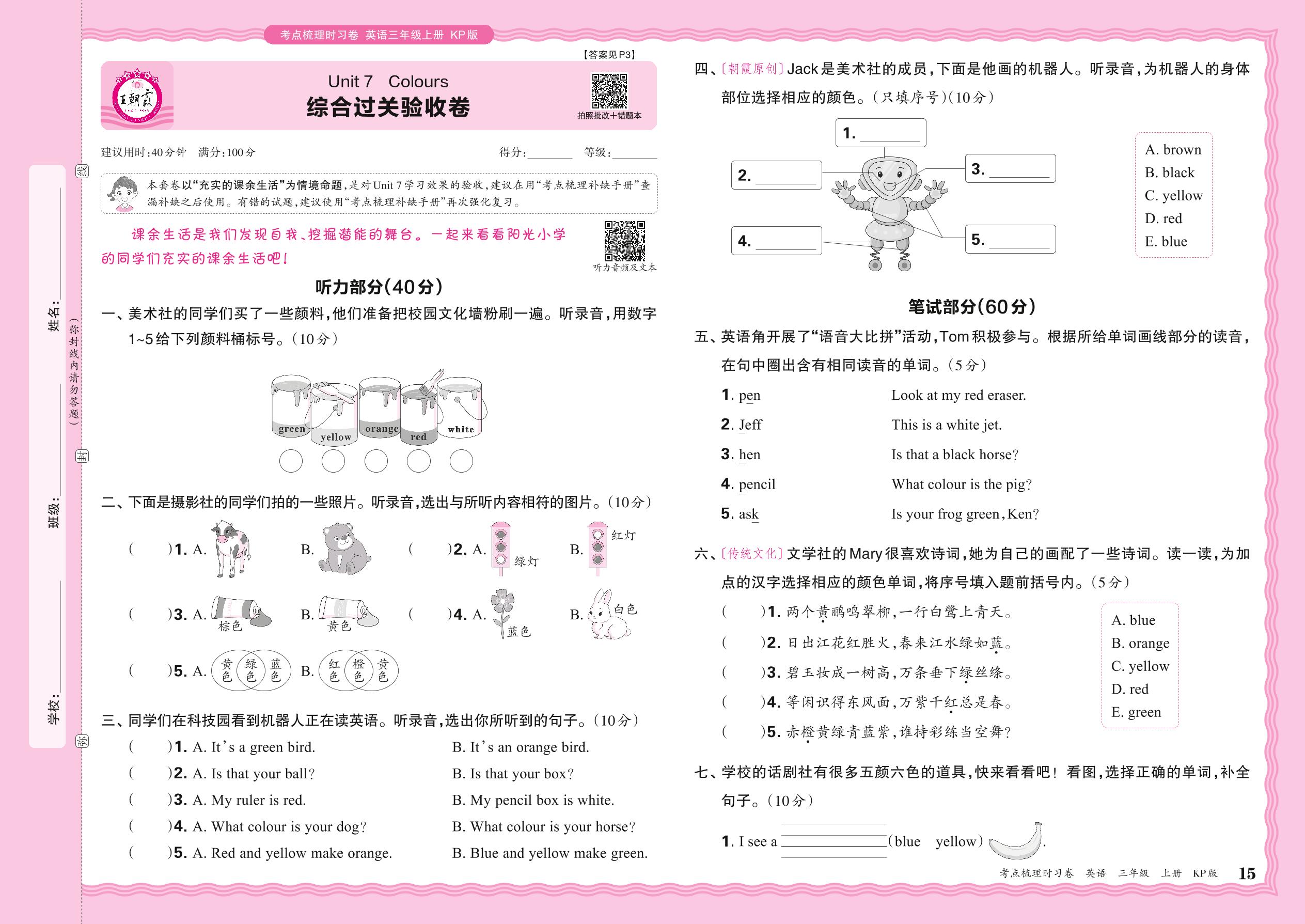 2024秋上册三年级英语科普版 Unit 7 综合过关验收卷