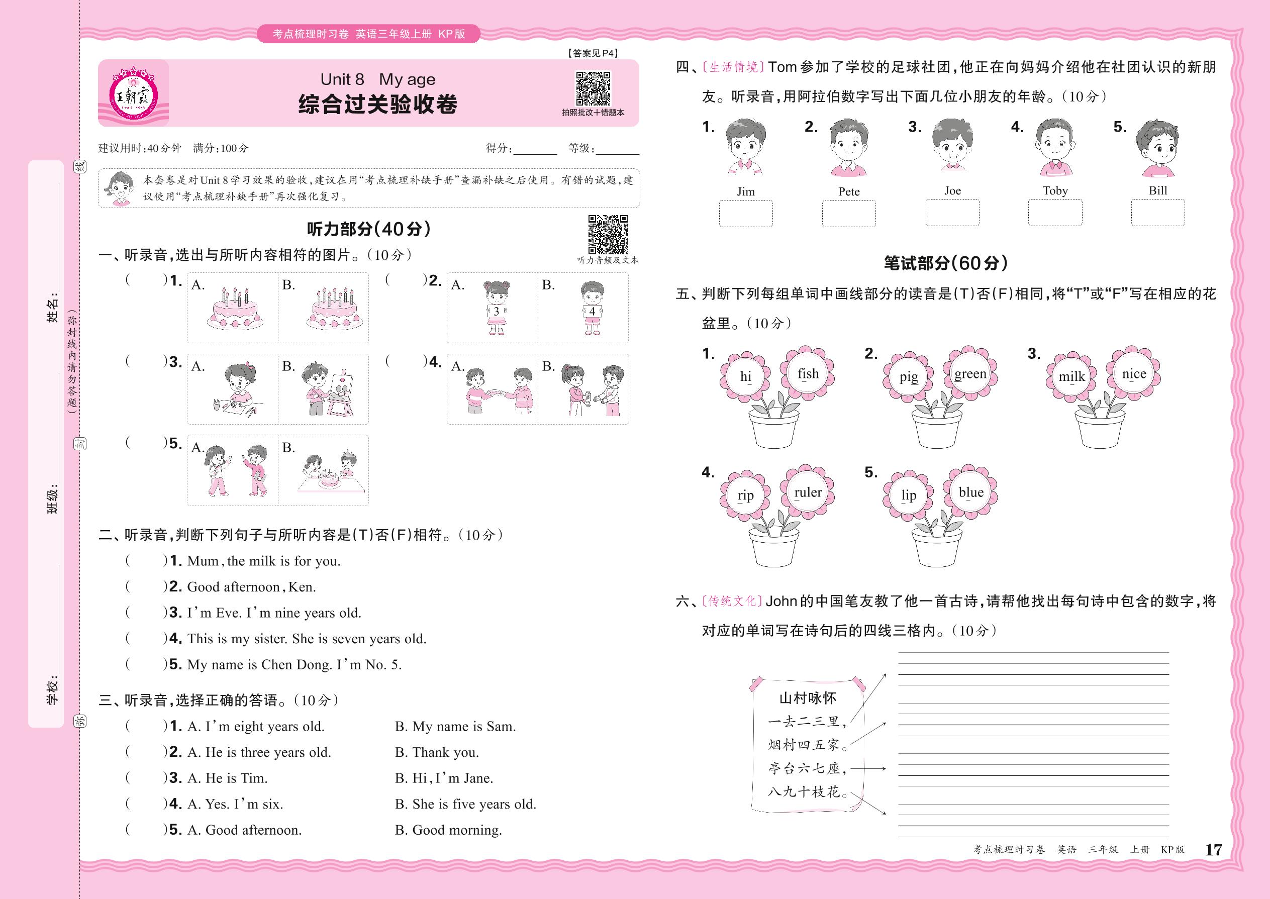 2024秋上册三年级英语科普版 Unit 8 综合过关验收卷