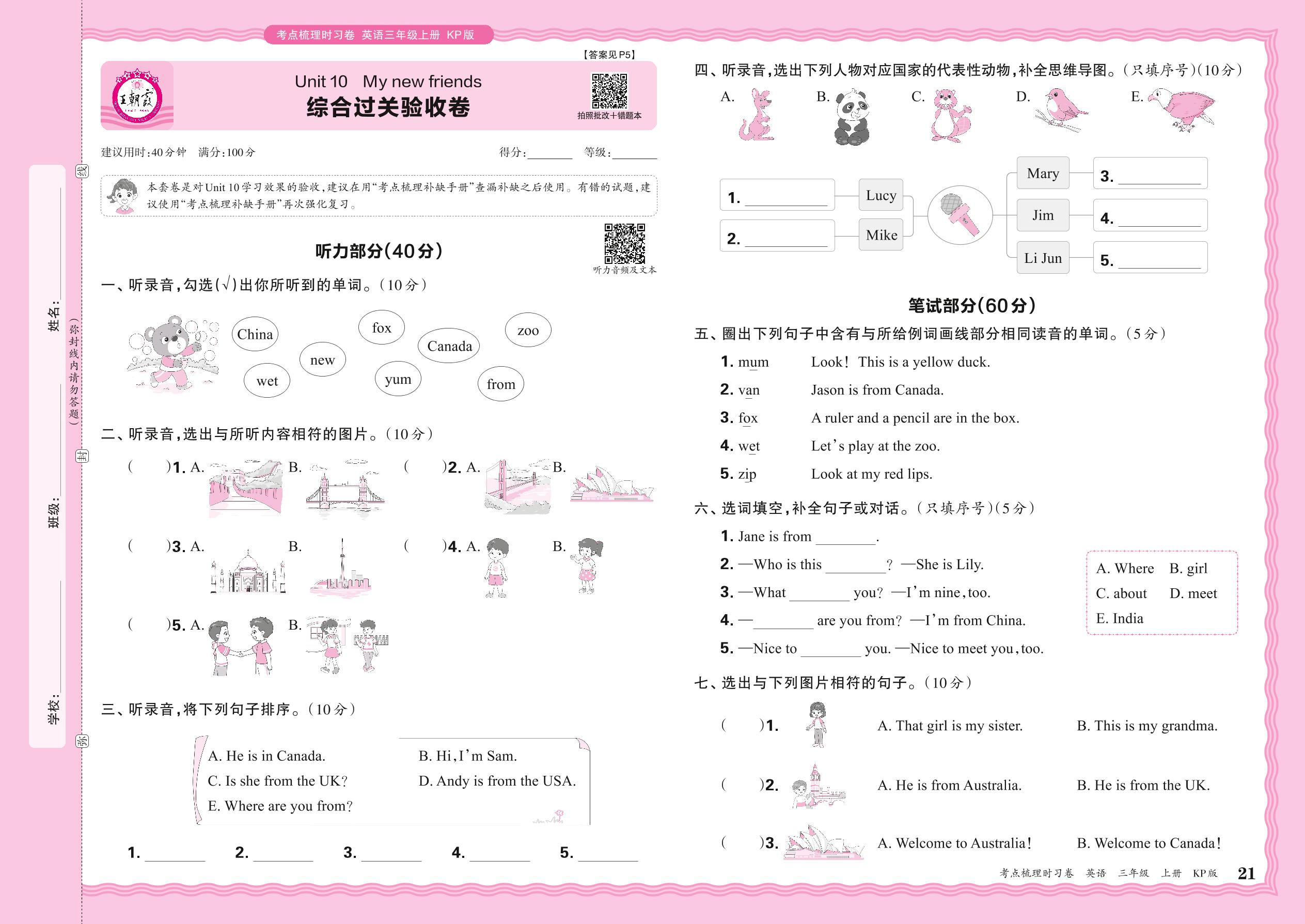 2024秋上册三年级英语科普版 Unit 10 综合过关验收卷