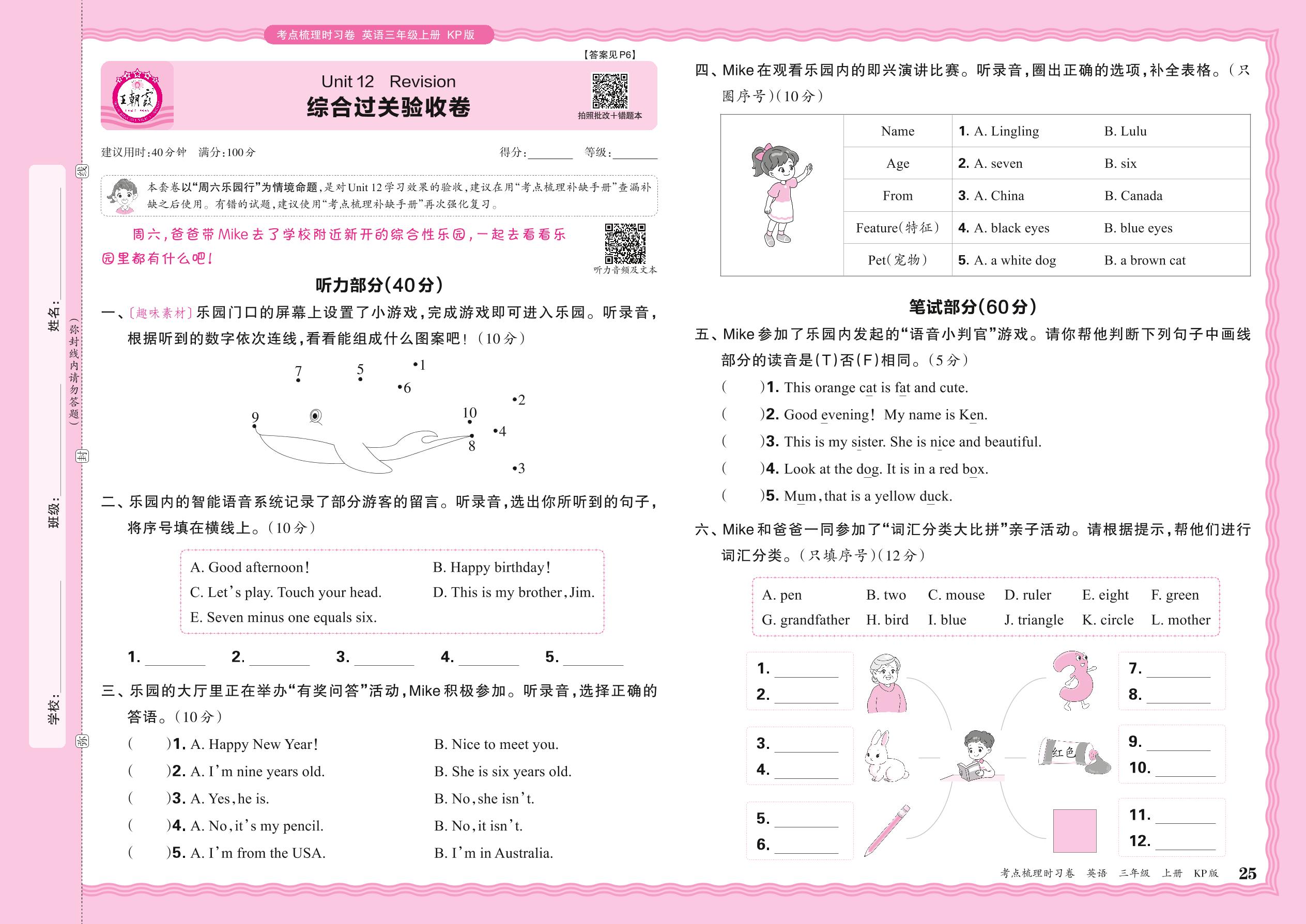 2024秋上册三年级英语科普版 Unit 12 综合过关验收卷