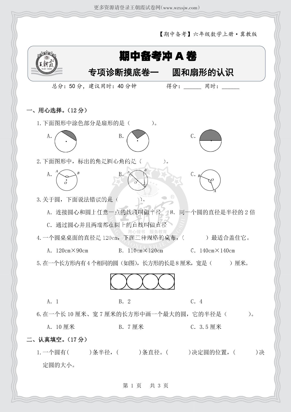 【期中备考】六年级数学上册冀教版·专项诊断摸底卷一 圆和扇形的认识