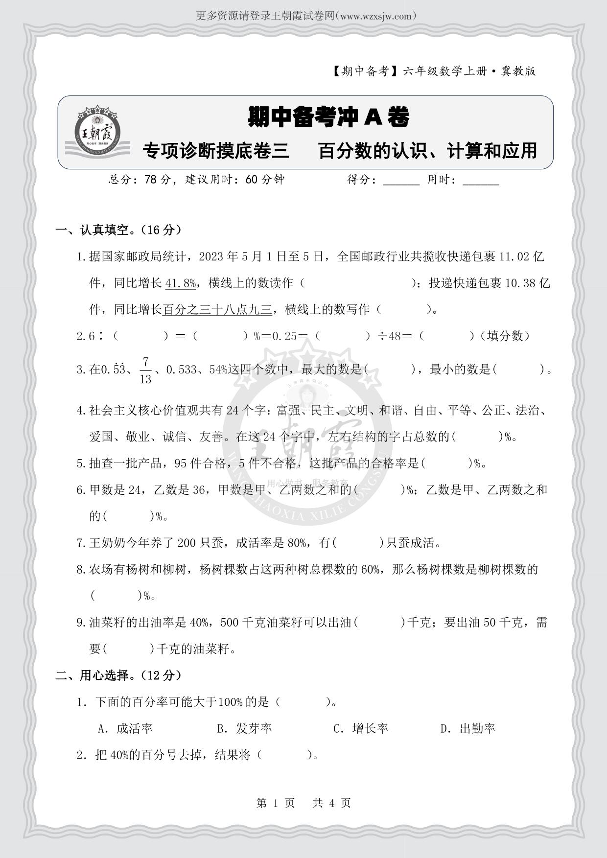 【期中备考】六年级数学上册冀教版·专项诊断摸底卷三 百分数的认识、计算和应用