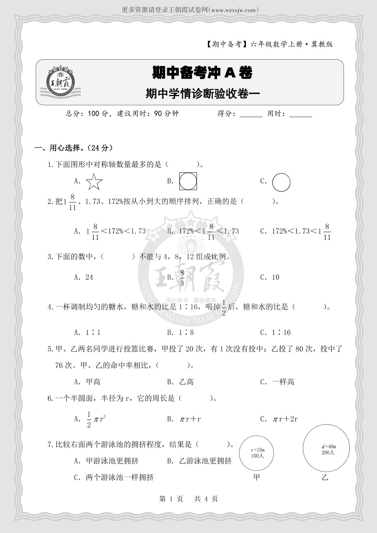 【期中备考】六年级数学上册冀教版·期中学情诊断验收卷一