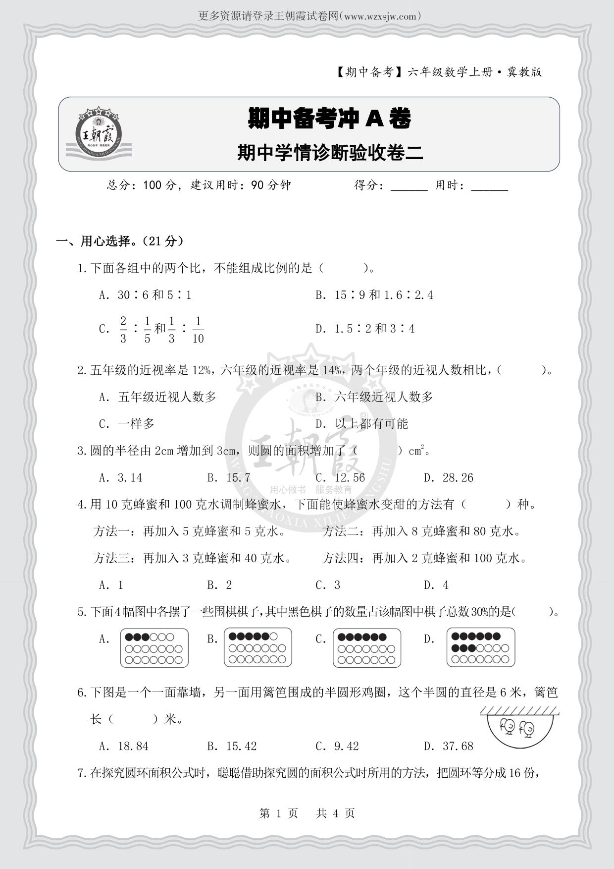 【期中备考】六年级数学上册冀教版·期中学情诊断验收卷二